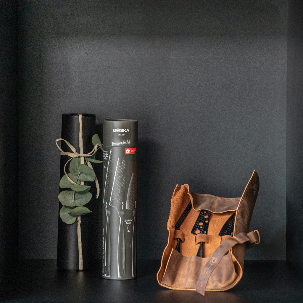 BOSKAn - B Corporation -sertifioidun yrityksen - juustoveitsisarja Monaco+ Black tarjoaa täydellisen leikkausratkaisun kaikenlaisille juustoille pehmeästä Briestä kovaan parmesaaniin. Nämä ainutlaatuiset ruostumattomasta teräksestä valmistetut, tarttumattomat veitset, joissa on aitoa nahkaa oleva suojakotelo, ovat ihanteellinen ja tyylikäs lahja todellisille juuston ystäville ja ruoanlaiton harrastajille. Tämä setti on jääkaappiturvallinen, vain käsin pestävä ja sillä on 10 vuoden takuu.
