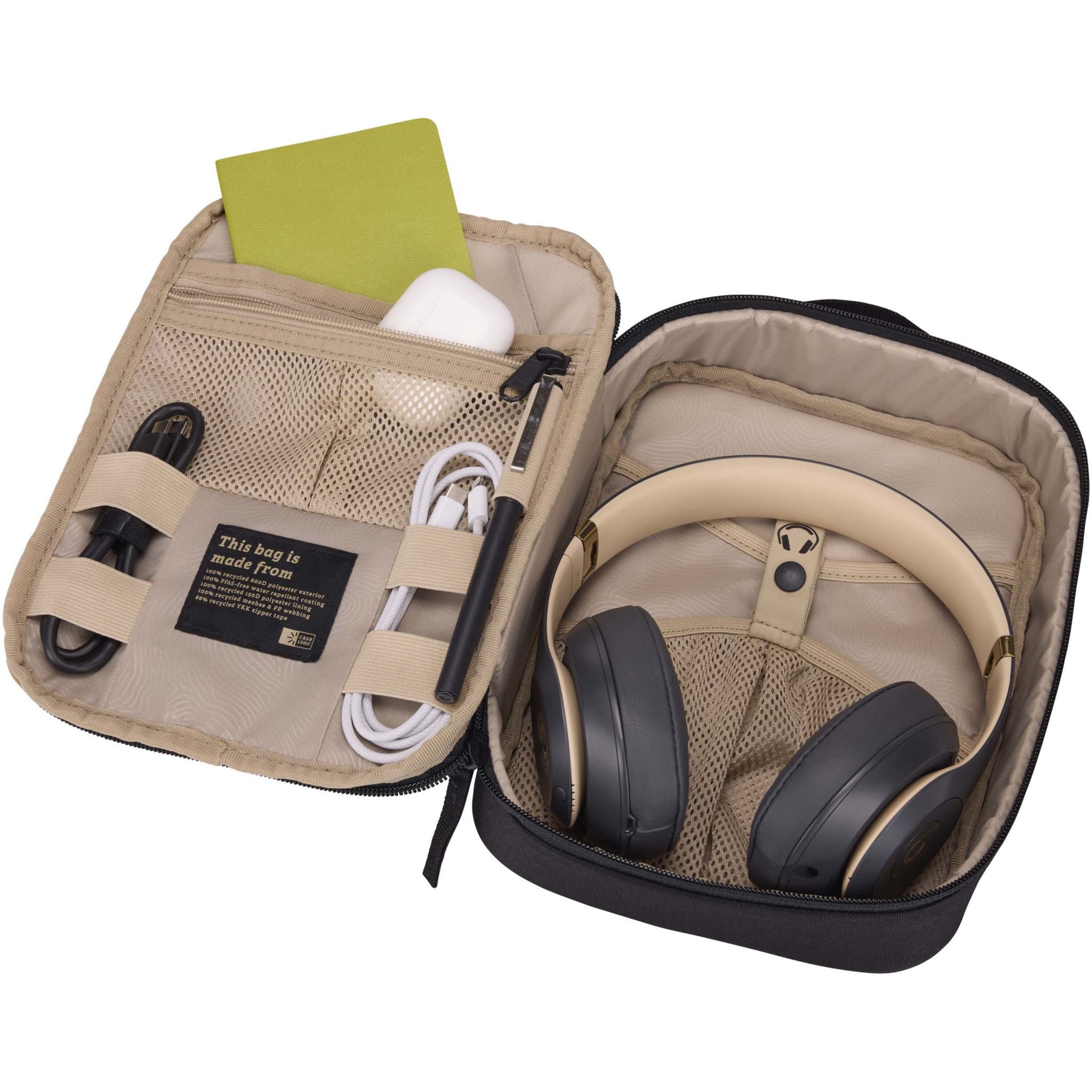 Case Logic Invigo -tarvikelaukussa on tilaa kaapeleille, kuulokkeille, sovittimille ja muille henkilökohtaisille tavaroille. Sopii käytettäväksi isomman laukun sisällä tai sellaisenaan. Tämän laukun ulkopuoli valmistettu 100-prosenttisesti kierrätetystä 600D-polyesterista ja vuori 150D-polyesterista. Laukussa on kynätasku, vetoketjullinen tasku, iso avoin tasku ja erilliset säilytyslokerot suuremmille tavaroille, kuten kuulokkeille.