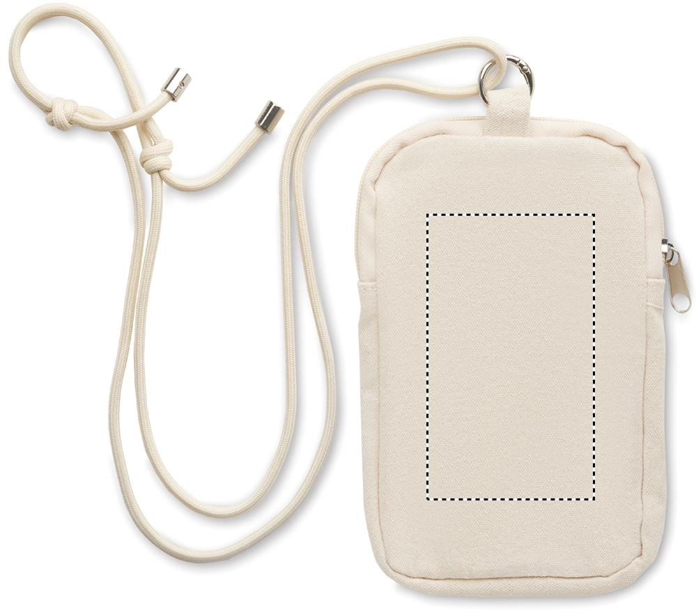 Crossbody-älypuhelinlaukku kierrätettyä puuvillaa, säädettävällä RPET-polyesterinauhalla ja avotaskulla edessä. 280 g/m².