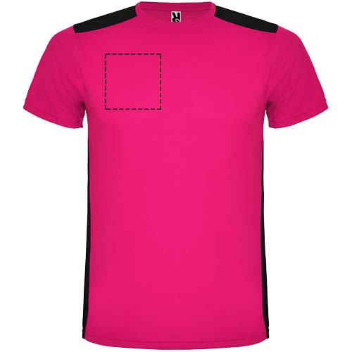 Helposti kuivuva, tekninen ja hengittävä kangas. Pyöreä kaula-aukko. Kahden polyesterikankaan yhdistelmä selässä ja olkapäissä. Bird's eye -kangas edessä ja hengittävä 3D-verkkokangas takana. Kangas, joka on suunniteltu imemään kosteutta. Sivuilla ja olkapäillä koristeellinen siksak-tikki. Selkäosa hieman pidempi. Irrotettava etiketti.