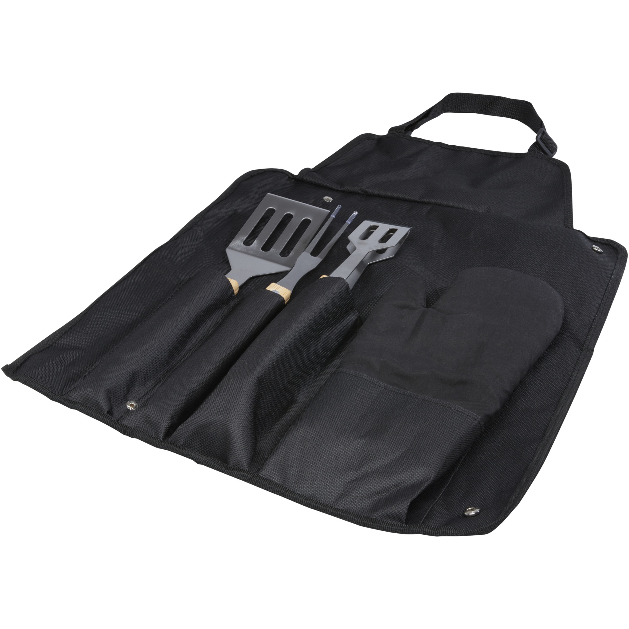 5-osainen grillausvälinesetti, johon kuuluu lasta (36,5 x 7 cm), haarukka (36,5 x 2 cm), pihdit (36,5 x 5 cm), kinnas (25 x 16 cm) ja pussillinen esiliina (42 x 60 cm). Kahvat on valmistettu bambusta, joka on hankittu ja valmistettu kestävien standardien mukaisesti.