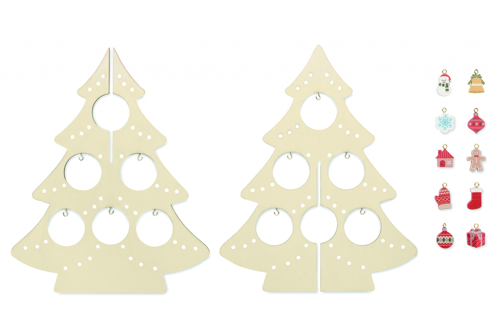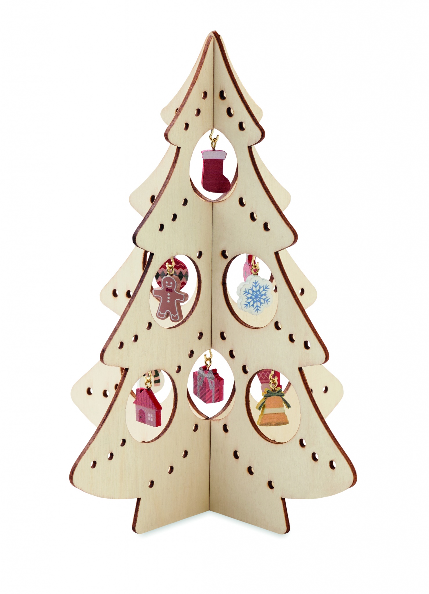 Vanerista valmistettu siluettijoulukuusi, 10 erilaisella koristeella. Itse koottava.