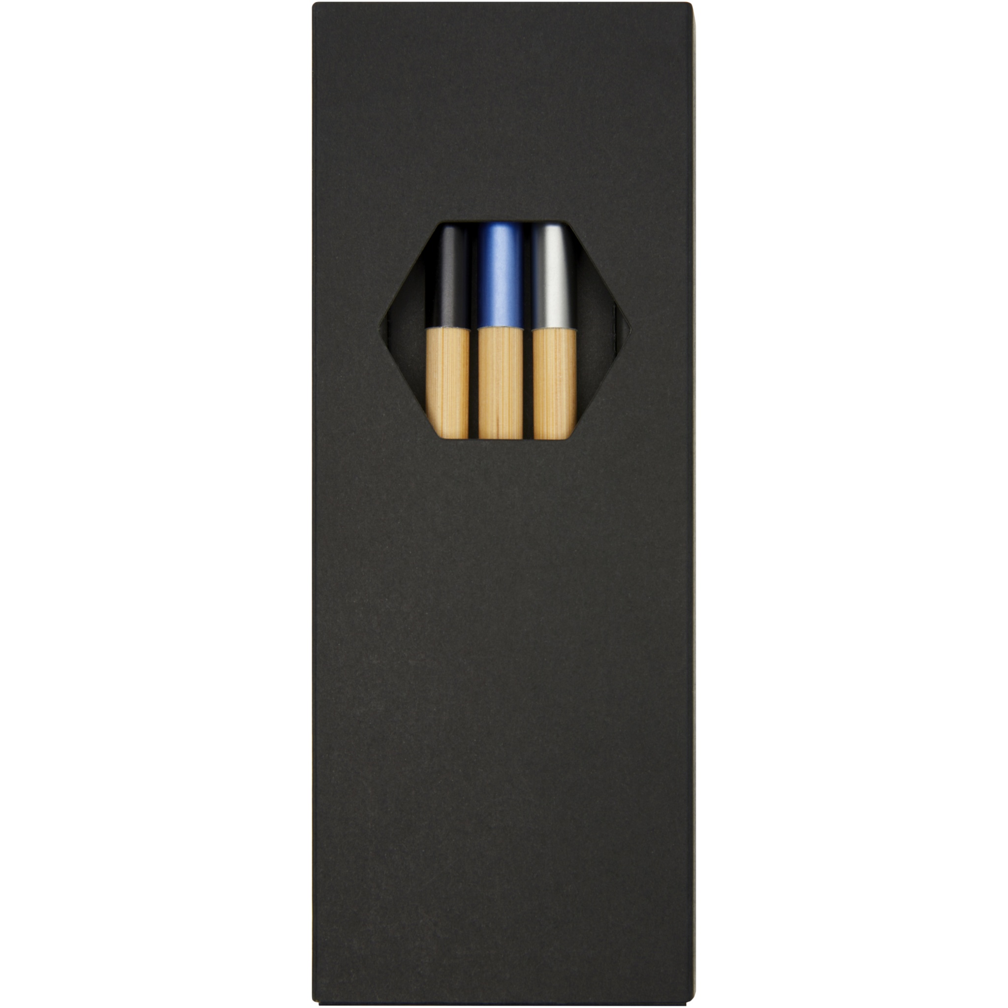 Upeasti muotoiltu kuulakärkikynäsarja, jossa on kolme värikorostuksella varustettua kuulakärkikynää. Tämä sinisellä alumiinilevyllä varustettu kuulakärkikynä on esitäytetty sinisellä värillä, ja loput kaksi on esitäytetty mustalla värillä. Pakattu mustaan lahjapakkaukseen.
