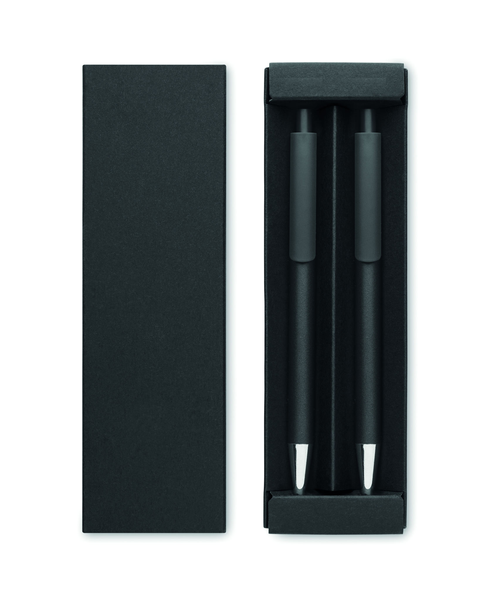 Kierrätetystä alumiinista valmistettu kynäsarja, jossa on 1 painonapin kuulakynä ja 1 musteton grafiittikynä. Sininen muste. Toimitetaan kierrätyspaperilaatikossa.