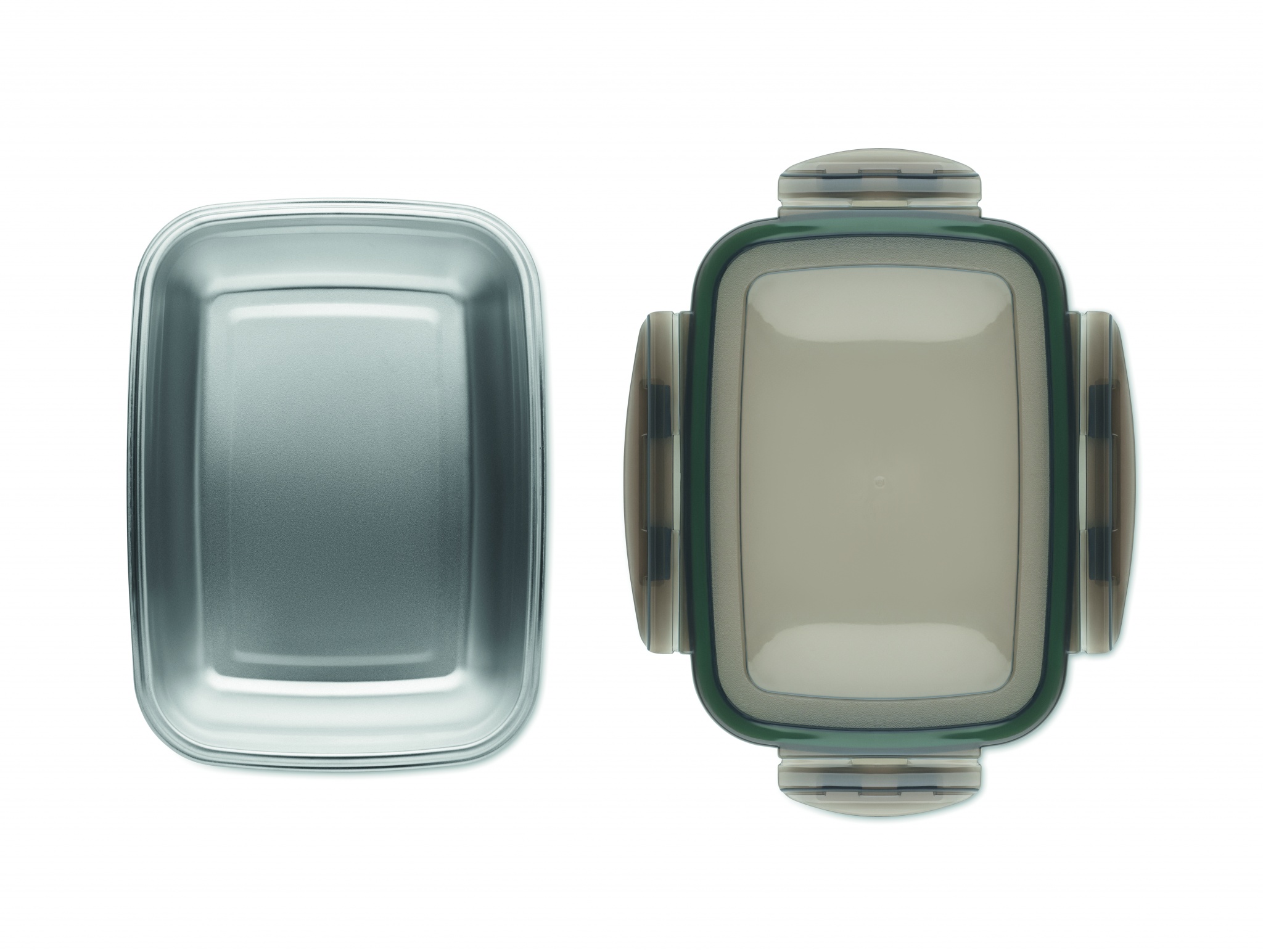 Kierrätetty kierrätetty ruostumattomasta teräksestä valmistettu lounaslaatikko, jossa on kierrätetty PP-kansi ja 4-sivuinen lukko. Tilavuus: 850 ml.
