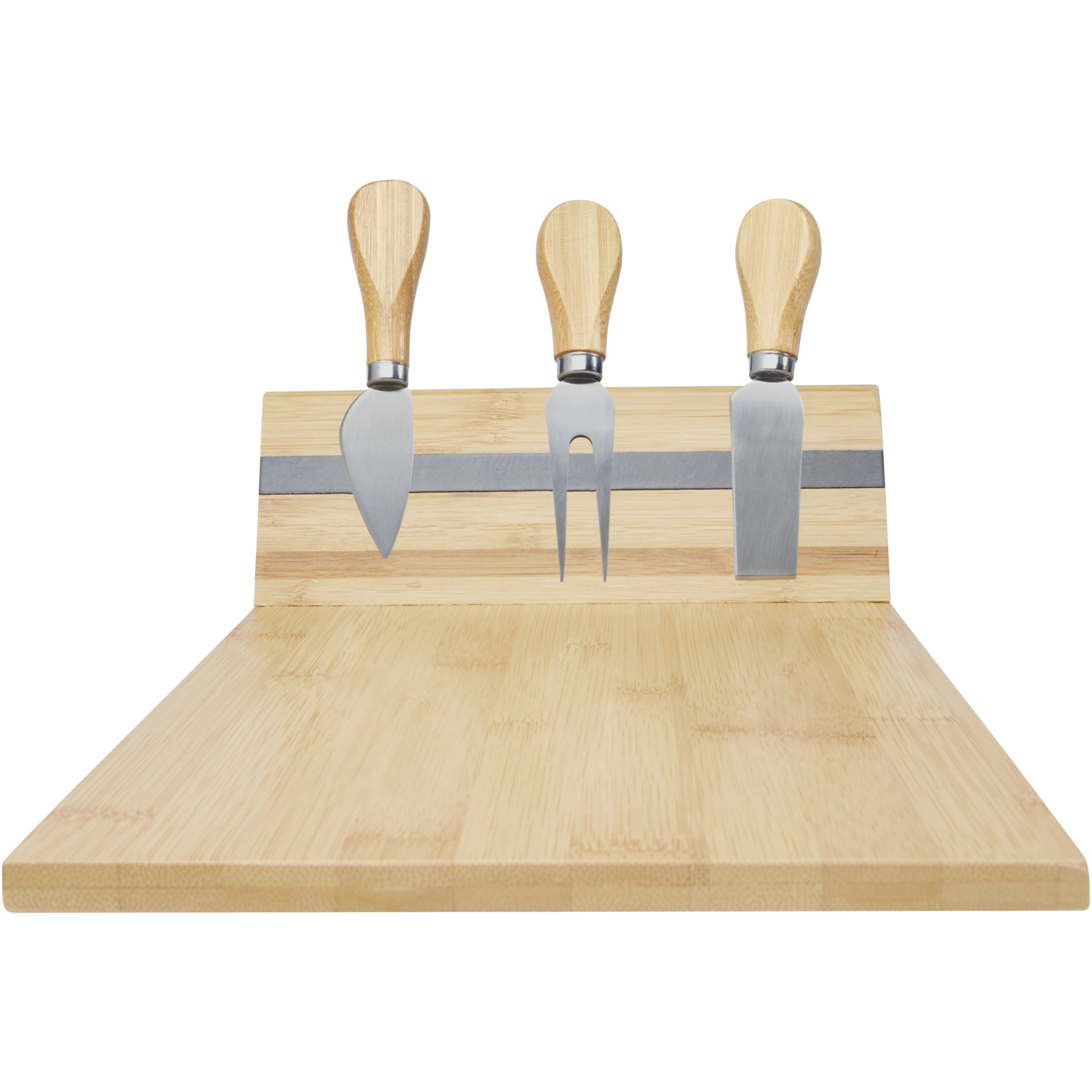Bambusta valmistettu juustontarjoilusarja, jossa on juustotarjotin (30 x 20,2 x 7,6 cm), 2 juustoveistä (12,5 x 2,5 cm ja 12,5 x 2,7 cm) ja juustohaarukka (13,5 x 2,4 cm). Juustotarjottimen sivulla on magneettinauha juustovälineiden kiinnittämiseen, jotta voit voit tarjoilla juustoja tyylillä. Tuotteessa käytetty bambu on hankittu ja valmistettu kestävän kehityksen standardien mukaisesti.