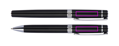 Kirjoitussetti, joka koostuu kierrettävästä kuulakärkikynästä, jossa on sininen kirjoitusjärjestelmän täyttö, ja sinisestä alumiinista valmistetusta kirjoitusrullapallosta kotelossa. Kromisovellukset ja kimaltelevat koristerenkaat antavat setille sen tyylikkään ilmeen. Logosi kaiverretaan molempiin kynään klipsien oikealle puolelle.