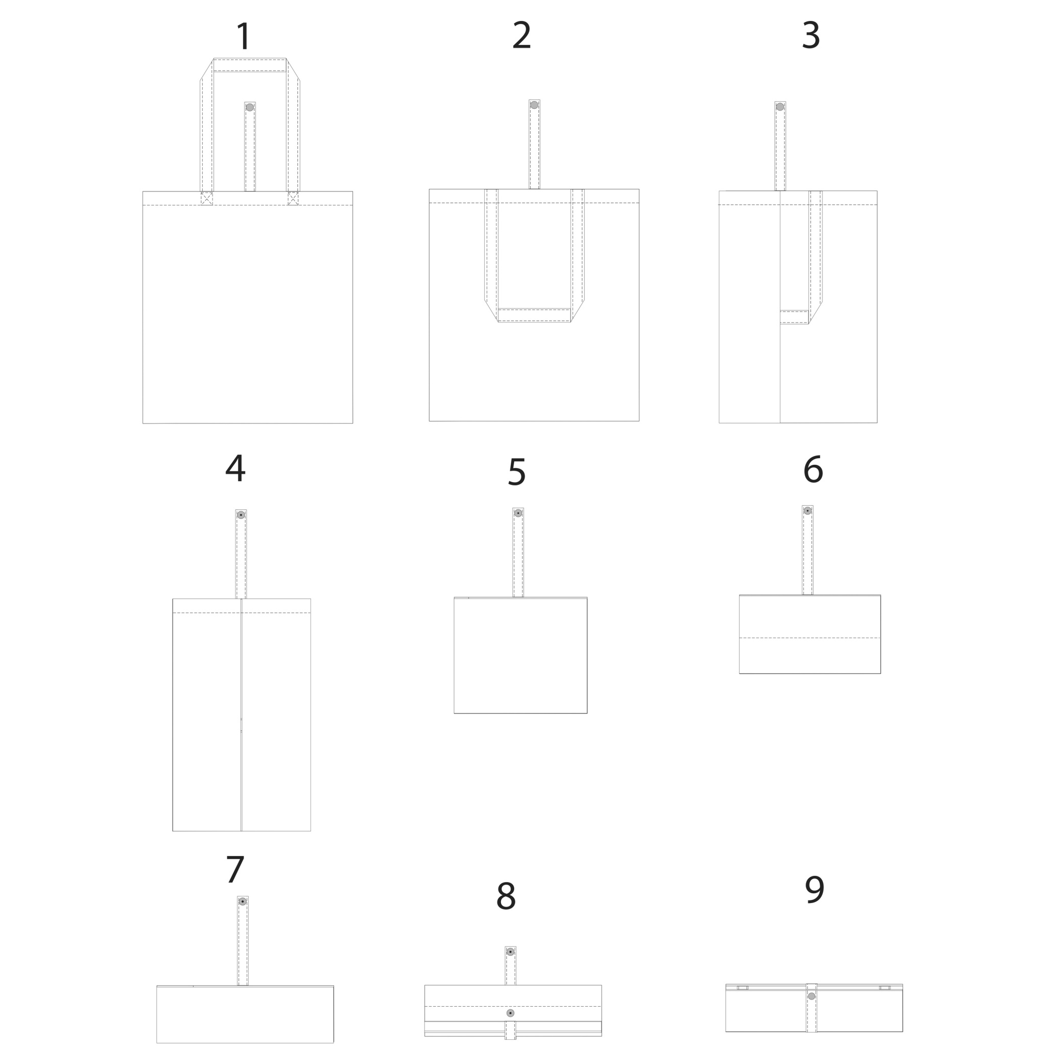 Kassi, jossa on avoin päälokero ja värilliset kahvat, joiden korkeus on 32 cm. Sisältää hihnan, jossa on nappi, jolla laukun voi pitää taitettuna. Kestää jopa 8 kg painon.