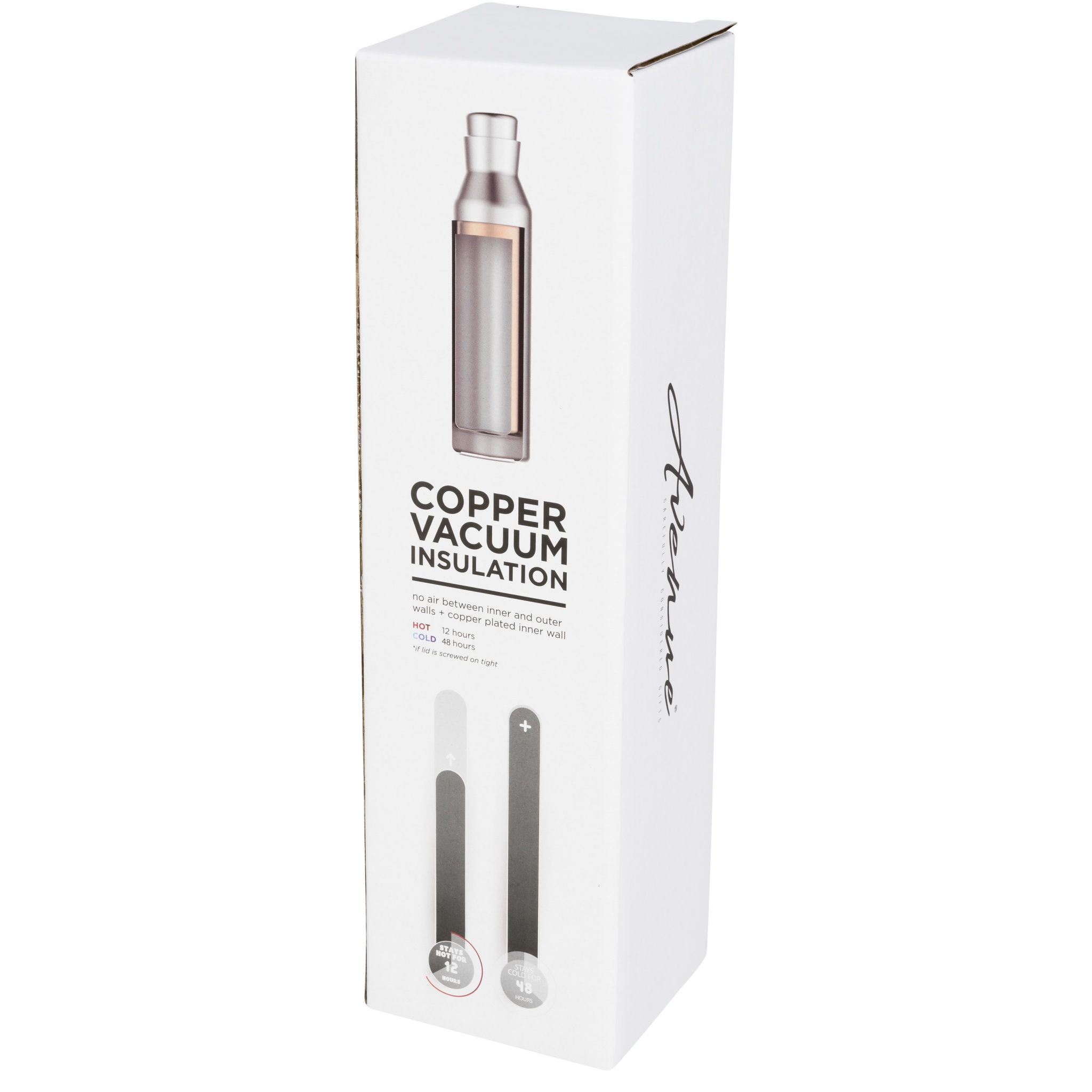 Kestävä, kaksinkertainen tyhjiörakenne kuparieristyksellä, jonka avulla juoma pysyy kuumana 12 tunnin ajan ja kylmänä 48 tuntia. Rakenne estää myös veden kondensoitumisen pullon ulkopuolella, ja kansi estää läikkymisen. Pullossa on innovatiivinen kierrekorkkikansi, joka näyttää korkkimateriaalilta. Sopii useimpiin tavallisiin auton mukinpidikkeisiin. Tilavuus on 590ml. Avenue-lahjapakkaus.