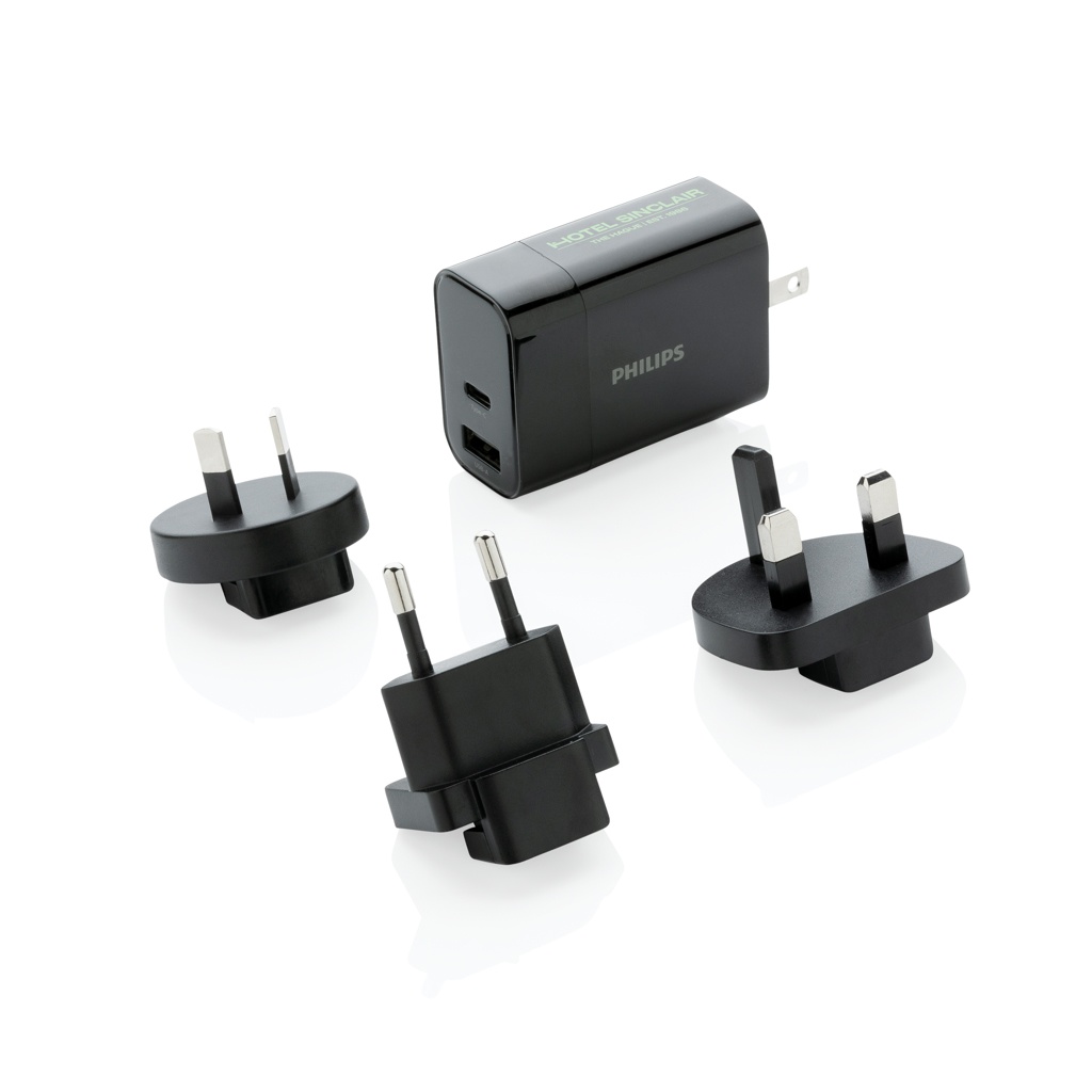 Philips huippunopea 30W PD matkalaturi. Kätevässä matkakotelossa. Mukana 4 pistoketta; sisäänrakennettu Yhdysvaltojen pistoke ja vaihdettavat Australian, Iso-Britannian ja Euroopan pistokkeet. Sisääntulo: 100-240V, 50-60Hz 0.7A. Ulostulo USB A 5V/2.4A, Tyyppi C 5V/3A, 9V/2A, 12V/1.5A. Pakattu Philips lahjapakkaukseen.
