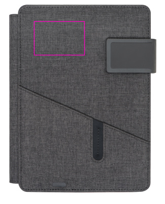 Powerbank-kansio A5 integroidulla virtapankilla (4 000 mAh), muistikirjalla (128 sivua) ja taskulla edessä. Tulo: 5V/1A - Lähtö: 5V/2.1A. Painamme logosi etupuolelle.