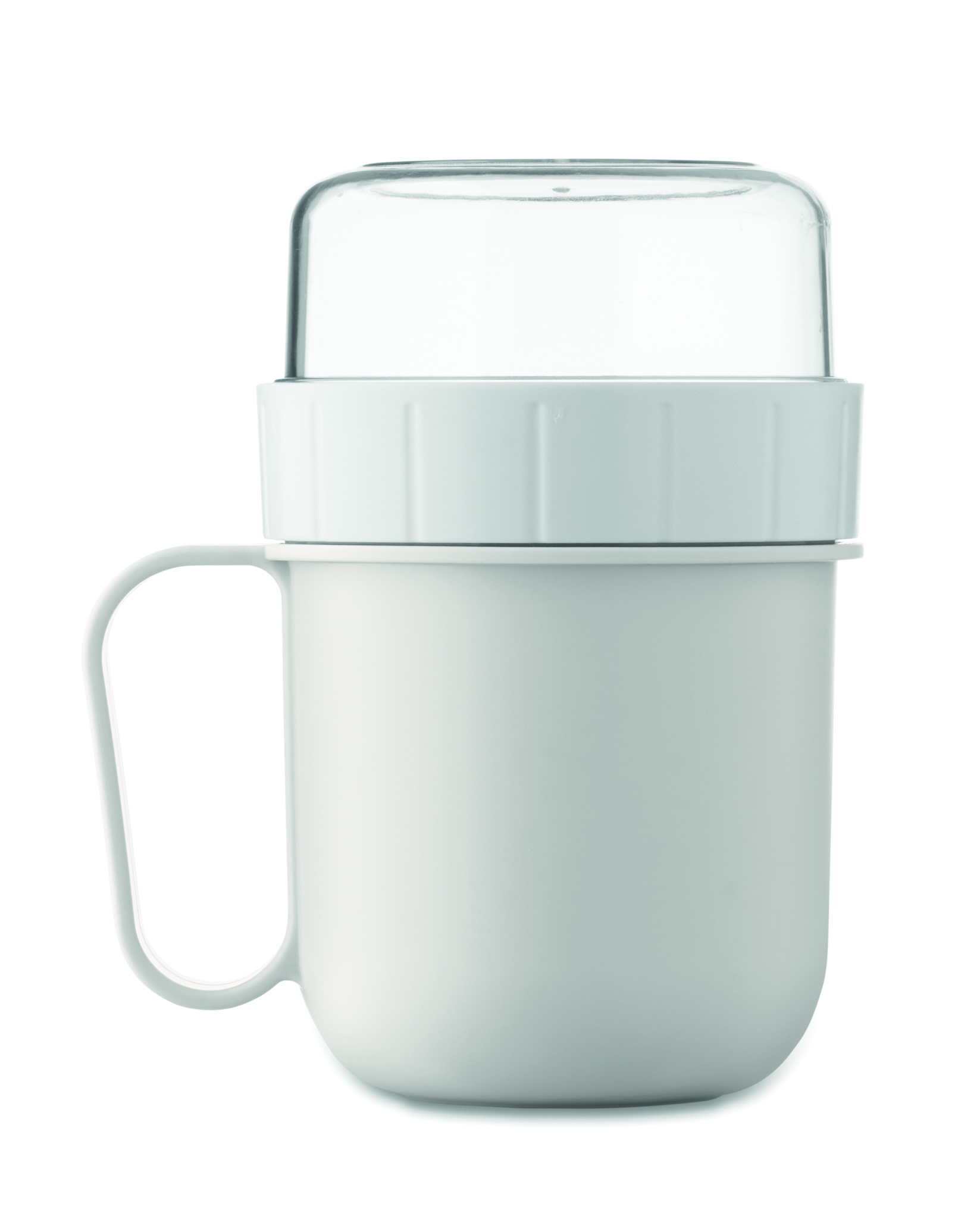 Aamiaista tai brunssia mukaan otettavaksi tarkoitettu kuppi PP- ja PS-korkissa. Sisältää kaksi erillistä rasiaa, jotka pitävät ainekset erillään. Tilavuus: 450 ml ja 160 ml. Vuotamaton.