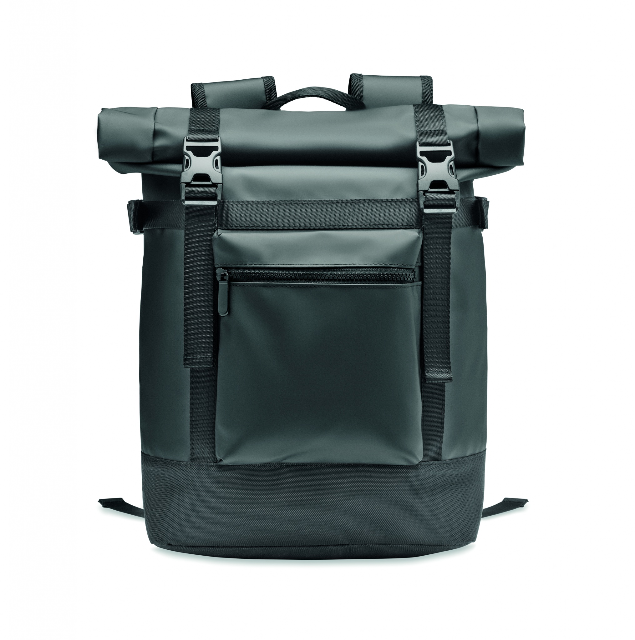Rullaamalla suljettava reppu 50C pressukankaasta. Repussa on pehmustettu selkäosa, pohja ja olkahihnavahvikkeet. Vetoketjulliset etutaskut.