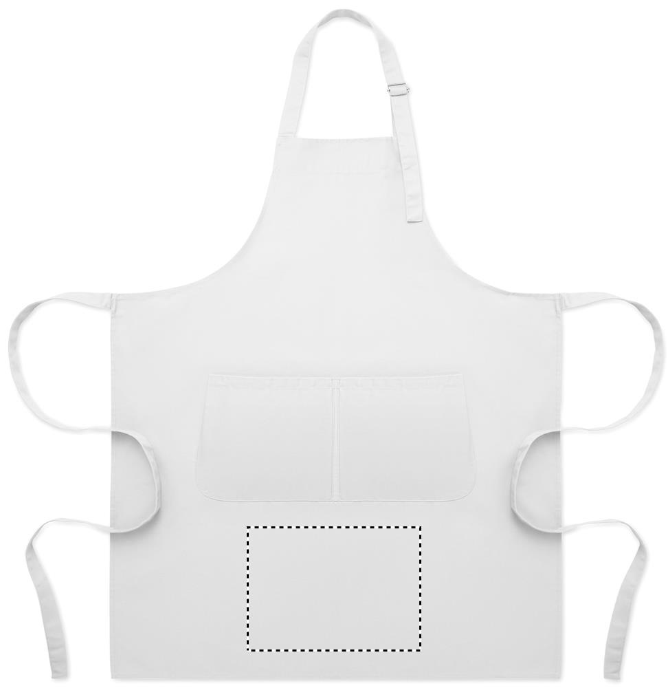 Pitkä, säädettävä keittiöesiliina 240 g/m² polypuuvillaa (35 % puuvillaa, 65 % polyesteriä), jossa kaksi etutaskua ja säädettävä hihna metallisoljella.