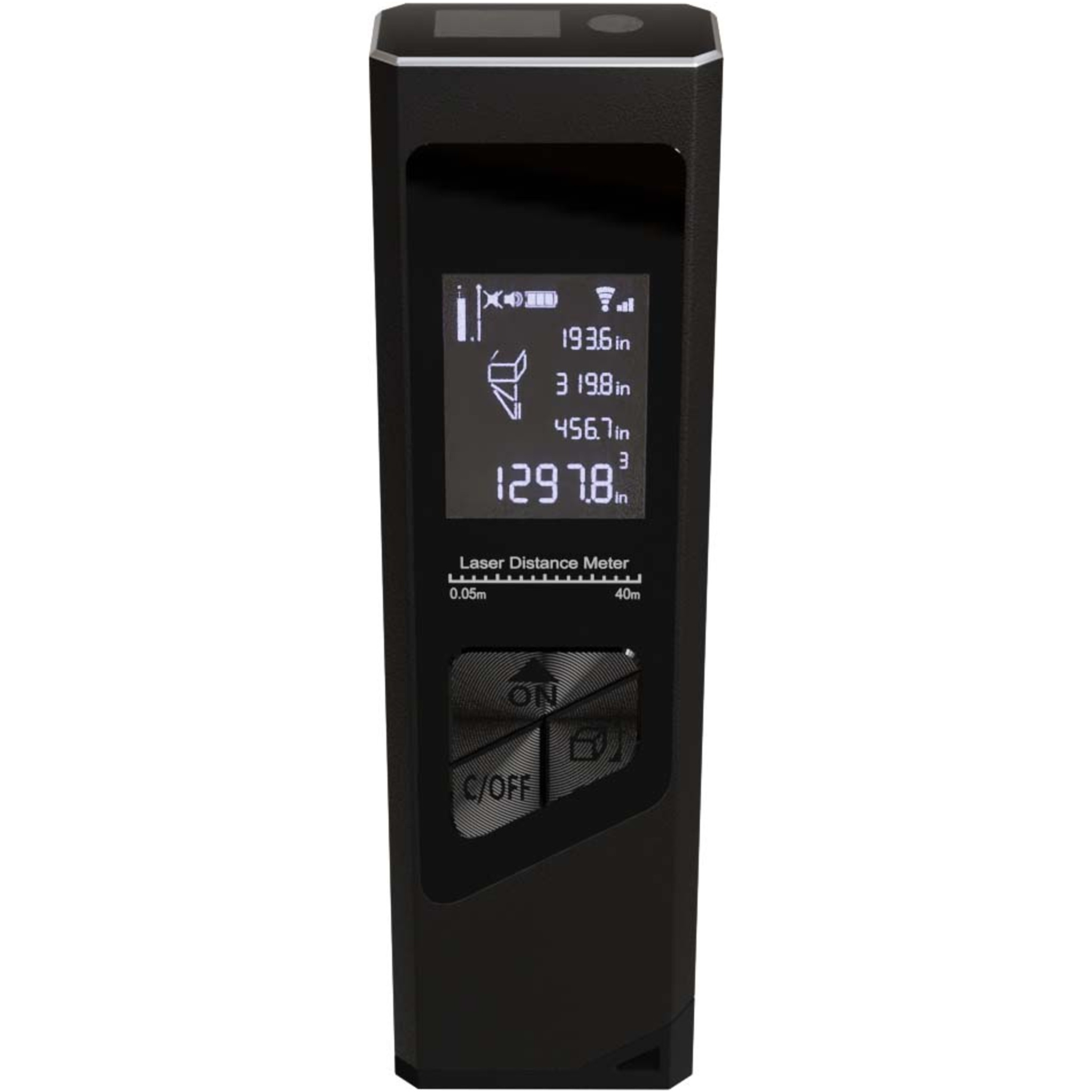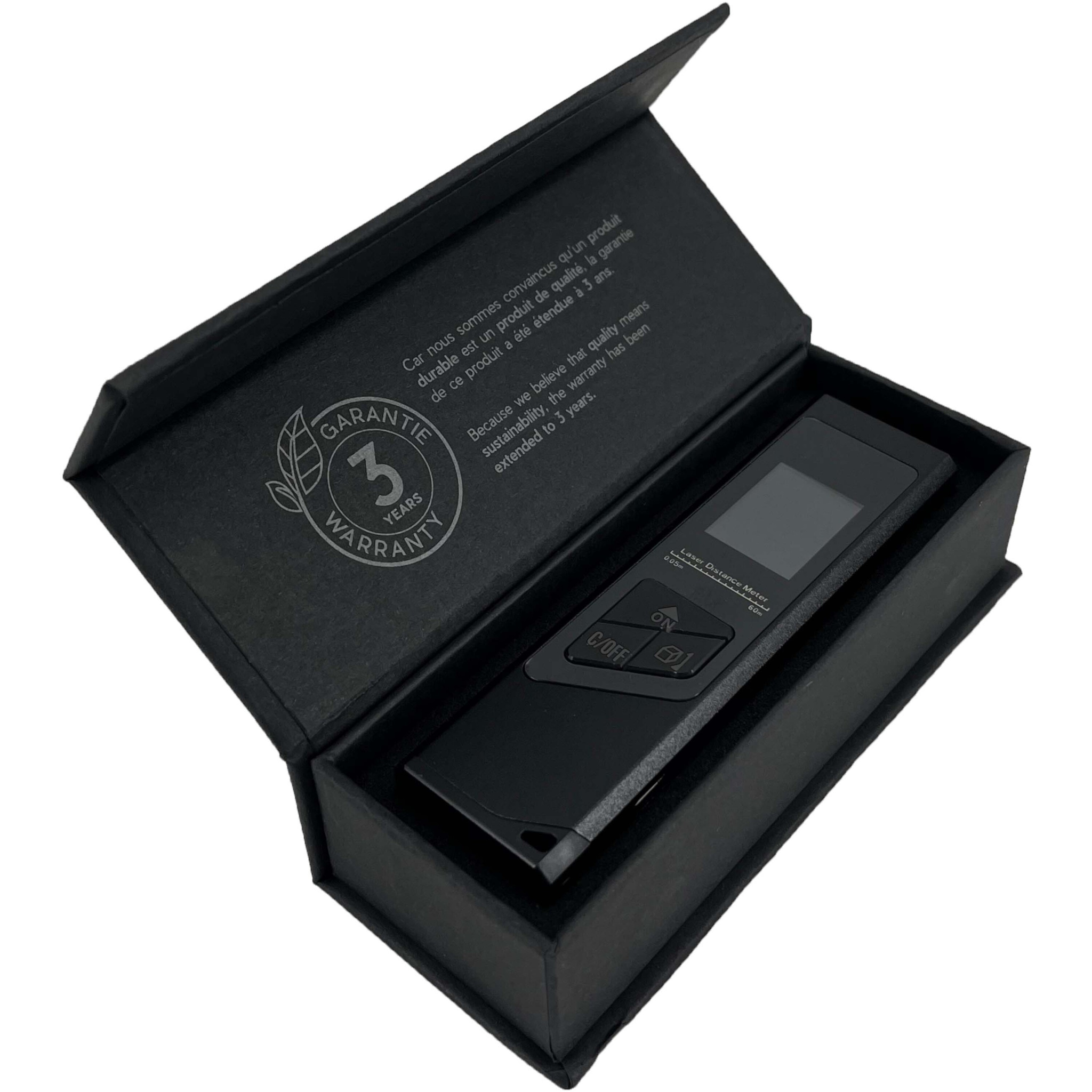 Minilaseretäisyysmittari on helpompi, nopeampi ja tarkempi tapa mitata pinta-alaa ja tilavuutta. Lisäksi siinä on myös Pythagoras-toiminto. Lasertarkkuusteknologian ja reaaliaikaisen mittaustilan ansiosta se tarjoaa luotettavia mittauksia jopa 40 metriin asti. Etäisyysmittari käyttää energiaa säästävää 200 mAh:n litiumioniakkua virtalähteenä ja voi mitata etäisyyden jopa 2 000 kertaa täydellä akulla. Taustavalaistu näyttö helpottaa katselua myös pimeillä alueilla. Koko: 9 x 2,4 x 1,1 cm. Pakattu kierrätetystä paperista valmistettuun lahjapakkaukseen (10,2 x 4,2 x 3 cm), jossa on magneettinen suljenta. Kolmen vuoden takuu.