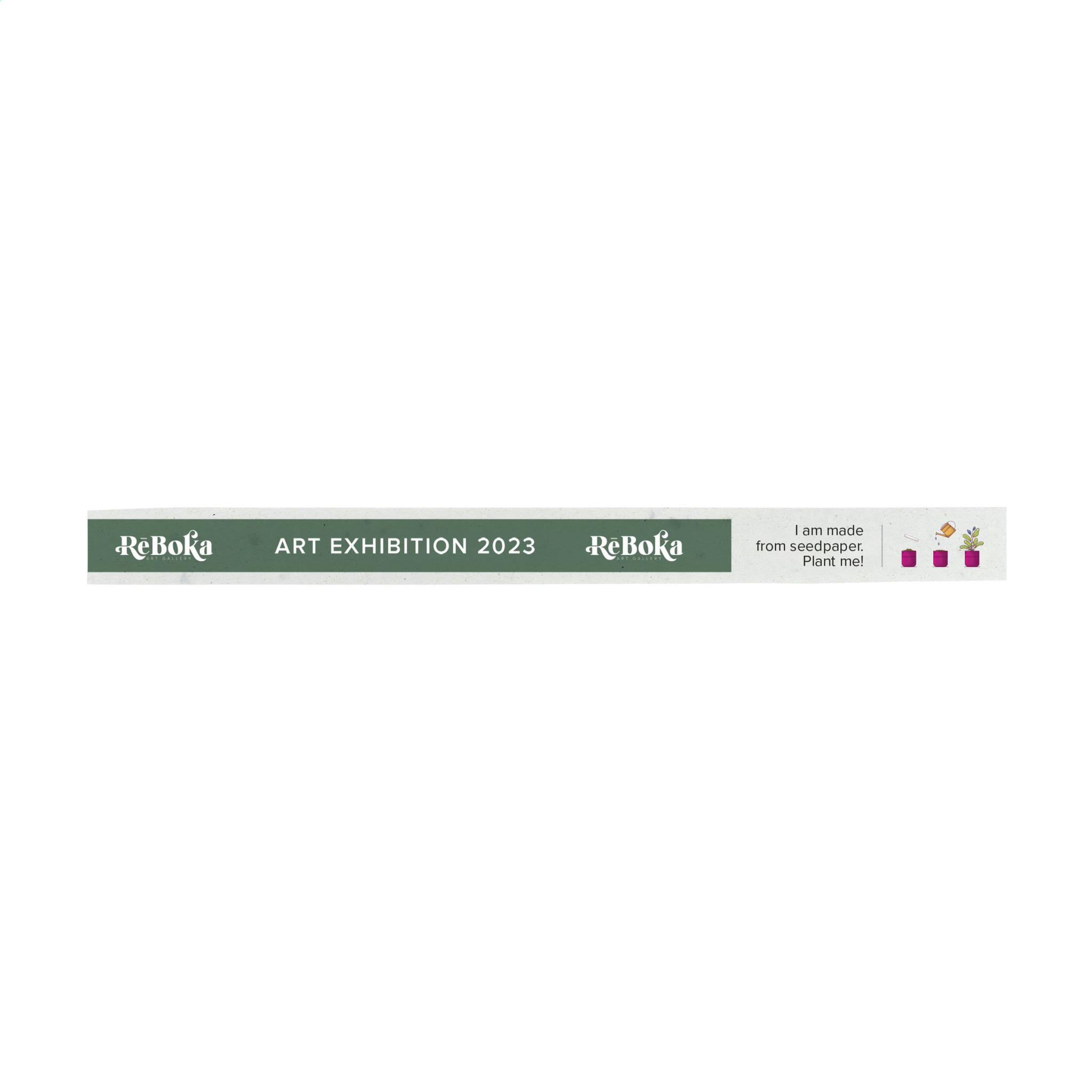 Vau! 100% kierrätetystä ja kierrätettävästä siemenpaperista valmistettu festivaalibändi, joka voidaan istuttaa kasvattamaan kukkia käytön jälkeen. Tarranauhasuljuksella. Sisältää täysvärisen painatuksen toisella puolella. Täydellinen ratkaisu tapahtumien ja festivaalien pääsyn hallintaan. Promootio ja toimiva. Kukkien siemenseos liimataan kahden kierrätysjätepaperikerroksen väliin (40 g/m²). Kun tapahtuma on ohi, voit istuttaa biohajoavan hihnan ja katsella siemenien kasvamista kukiksi. Peltokukkasekoitus koostuu: Feverfew (daisy) – Veilweed – Snapdragon – Crooked Flower – Silver Shield – Mexican – Petunia – Salvia – Summer Azalea – Ice Flower. Ympäristöystävällinen lahja, joka myös edistää terveen mehiläiskannan ylläpitämistä.