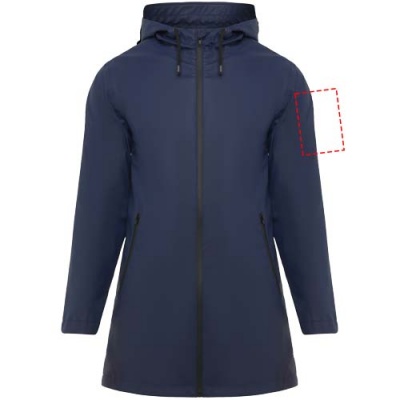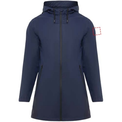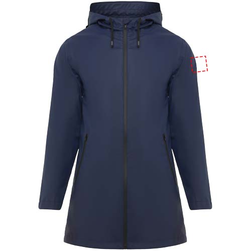 Vedenpitävä naisten sadetakki. Lipallinen huppu. Lämpösaumatut vetoketjut ja saumat. Mustat kontrastiväriset yksityiskohdat. Kaksi sivutaskua vetoketjuilla. Takaosan helmassa halkio. Irrotettava tuoetemerkki. Vedenpitävä. Kuvan malli on 179 cm pitkä ja hänellä on päällään koko S.