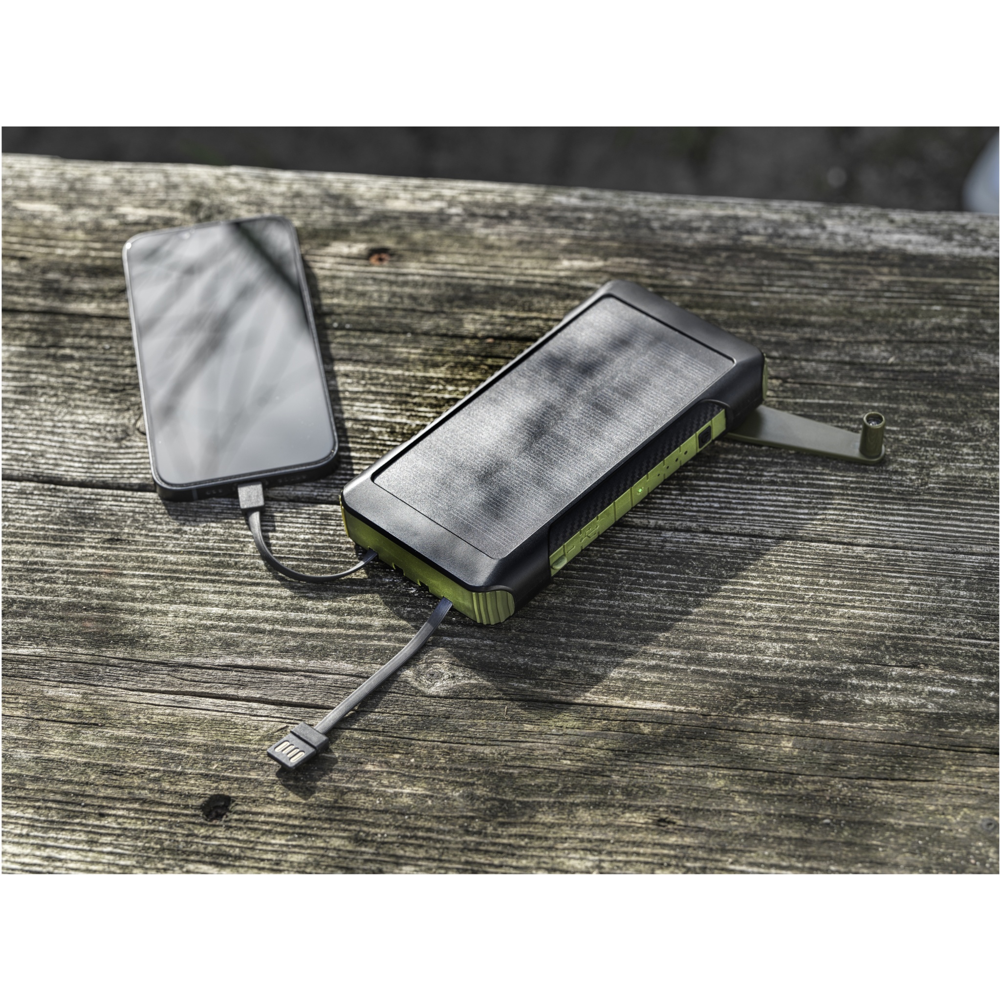 10 000 mAh:n aurinkovoimalla ladattava Soldy-varavirtalähde on valmistettu kierrätetystä RCS-muovista, ja se on ihanteellinen lataukseen ulkona. Siinä on käsikäyttöinen kampidynamo, joka tuottaa tehoa manuaalisesti siltä varalta, että virta loppuu eikä auringonvaloa ole. Varavirtalähdettä voidaan ladata myös laitteen Type-C- tai micro-USB-portin kautta. Tässä varavirtalähteessä on sisäänrakennetut latauskaapelit, joissa on Type-C-, iOS-, USB-A- ja mikro-USB-liittimet, joten sen avulla voi ladata useimpia älypuhelimia, kameroita, varavirtalähteitä, kuulokkeita jne. Varavirtalähteen enimmäislähtöteho on 2,4 A per portti. Tulotehon raja on 2 A. Mukana tulee käyttöohje ja 30 cm:n USB-A to Type-C -latauskaapeli, ja varavirtalähde on pakattu 100-prosenttisesti kierrätettyyn voimapaperilaatikkoon.
