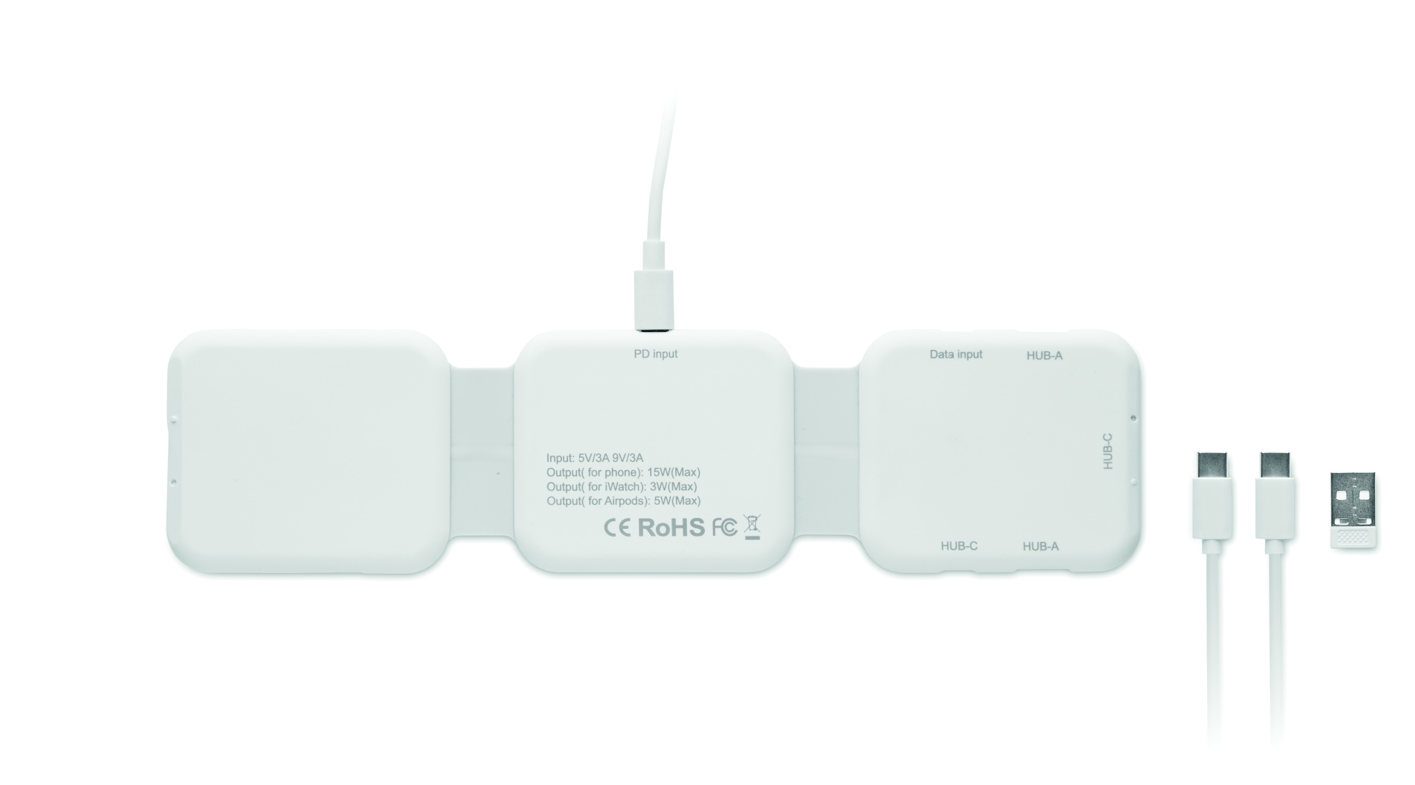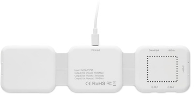 "Magneettinen latausasema ABS-muovista. 3 langatonta latauspistettä. 1 x 15 W, 1 x 5 W TWS:lle ja 1 Apple Watch -laturi (3 W). 2 Type-C- ja 2 USB-A-keskitintä. Liitin Type-C:stä USB-A;han."