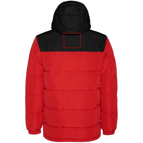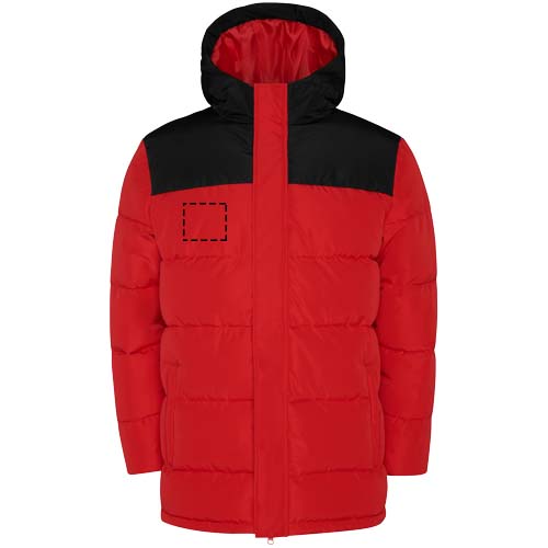 Topattu takki kiinteällä hupulla. Edessä vetoketju, jonka yllä napitus. Leukasuoja. Kaksi vetoketjullista sivutaskua. Joustavat hihansuut.