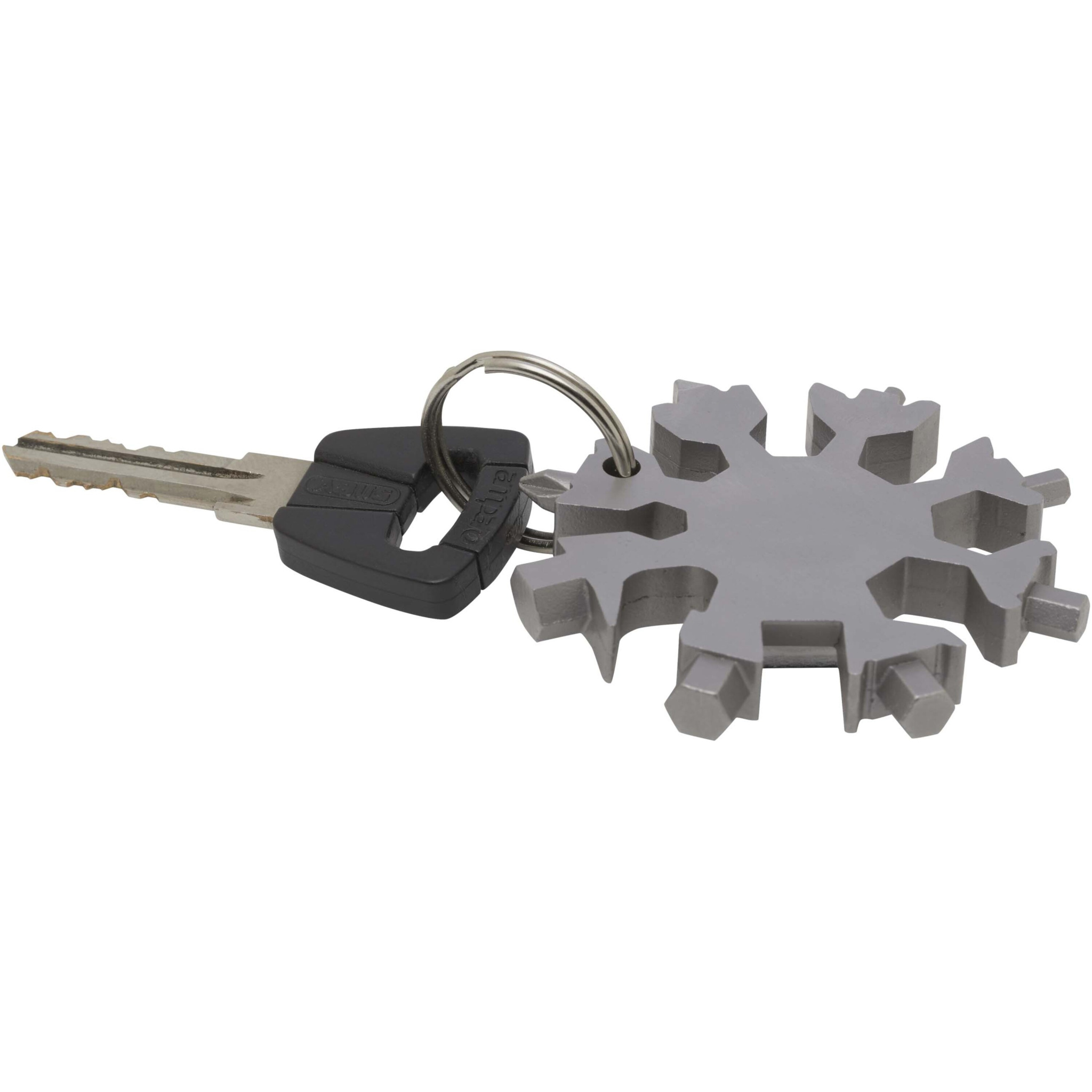 Tukeva ja kompakti kahdeksankäyttöinen ruostumattomasta teräksestä valmistettu monitoimityökalu, jota voi kuljettaa mukana avaimenperässä.