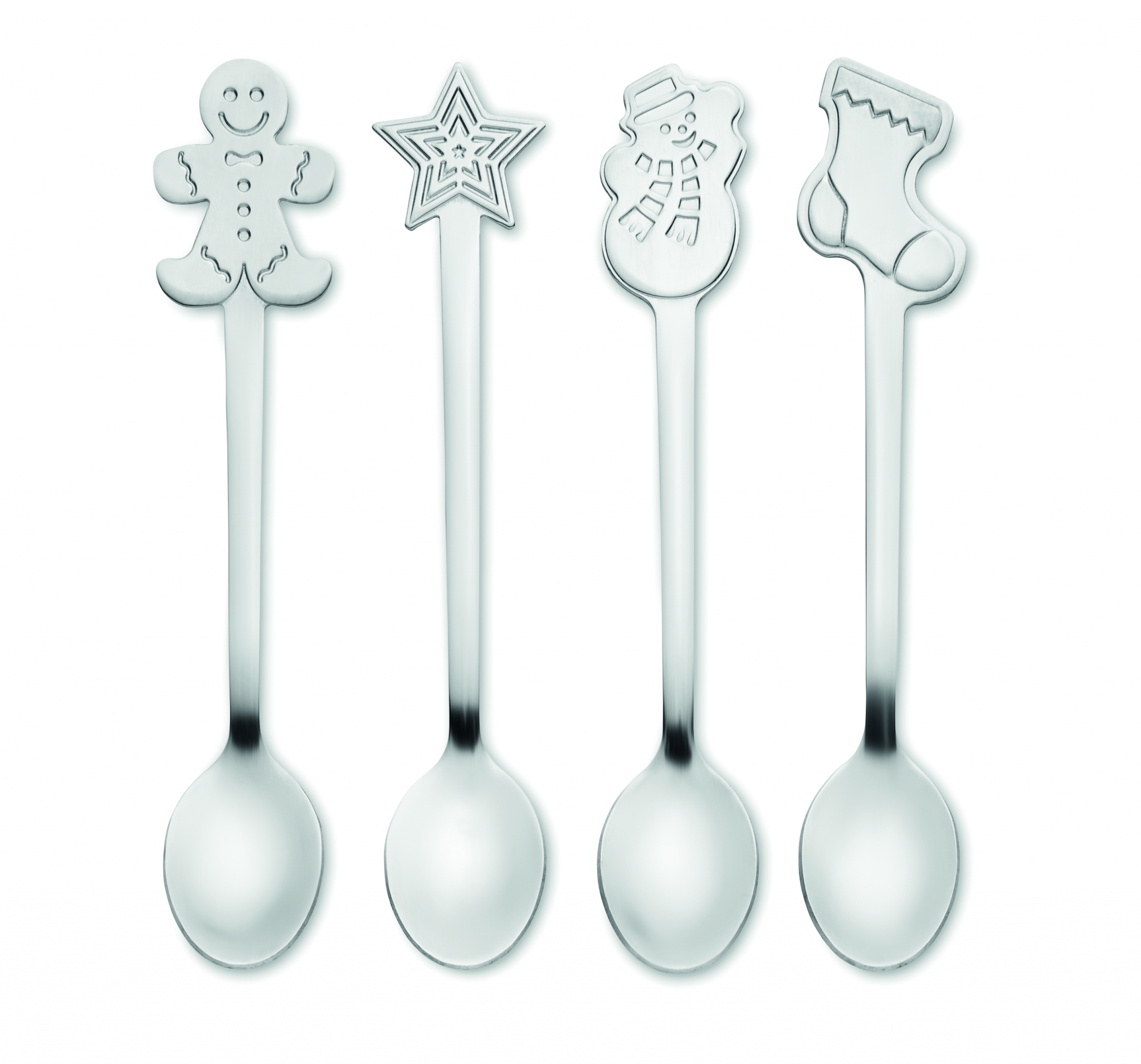 4 erilaista ruostumattomasta teräksestä valmistettua jouluaiheista teelusikkaa. Lahjapakkauksessa.