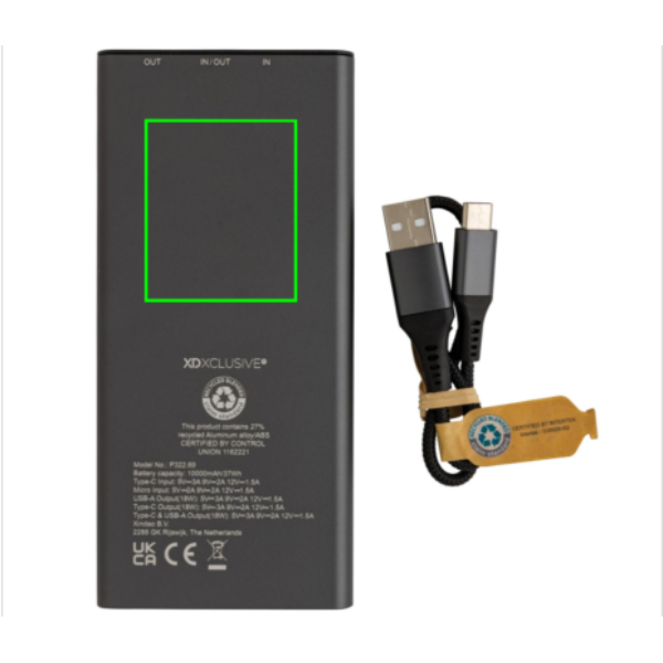 Ultranopeasti lataava virtapankki RCS (Recycled Claim Standard) sertifioidusta kierrätetystä alumiinista ja ABS:stä. Kierrätetyn materiaalin kokonaismäärä: 27% perustuen tuotteen painoon. Alumiini ei menetä ominaisuuksiaan kierrätysprosessissa, ja sitä voidaan kierrättää loputtomasti. Virtapankissa on A-luokan pitkäkestoinen 10000mAh:n litiumpolymeeriakku. Tyypin C lähtöportti tukee jopa 18W pikalatausta sekä nopeaa uudelleenlatausta 3 tunnissa. Virran merkkivalot kertovat jäljellä olevan virran määrän, ja siten tiedät, koska tuote tulee ladata uudelleen. Tuote ja lisätarvikkeet 100% PVC-vapaita. Sisältää tyypin C latauskaapelin valmistettuna RCS-sertifioidusta kierrätetystä alumiinista, TPE:stä ja PET:stä. Pakattu FSC®-sekoituksesta valmistettuun kraft-pakkaukseen. USB lähtövirta: 5/3A, 9V/2A. 12V/1.5A. Tyypin C lähtövirta: 5V/3A, 9V/2A, 12V/1.5A. Tyypin C tulovirta: 5V/3A, 9V/2A, 12V/1.5A. Mikro USB tulovirta: 5V/2A, 9V/2A, 12V/1.5A.