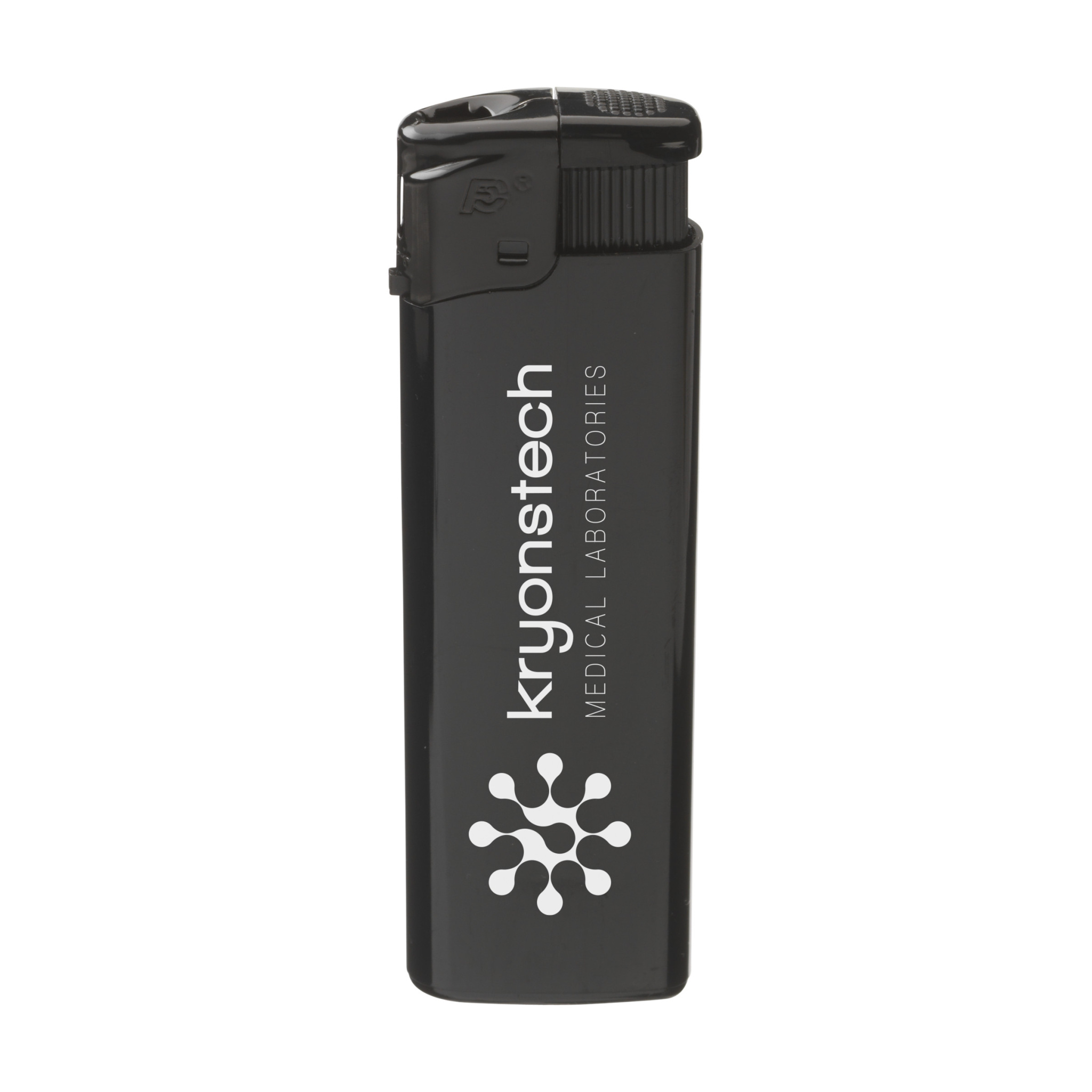 Elektroninen, täytettävä Flameclub®-sytytin säädettävällä liekillä. Tuulenpitävä. Kovallakin tuulella turbon liekki jää palamaan. Varustettu lapsilukolla. NEN-sertifioitu: EN13869. TÜV-sertifioitu ja ISO-sertifioitu: ISO9994. Sytyttimet toimitetaan vain painatuksen kanssa.