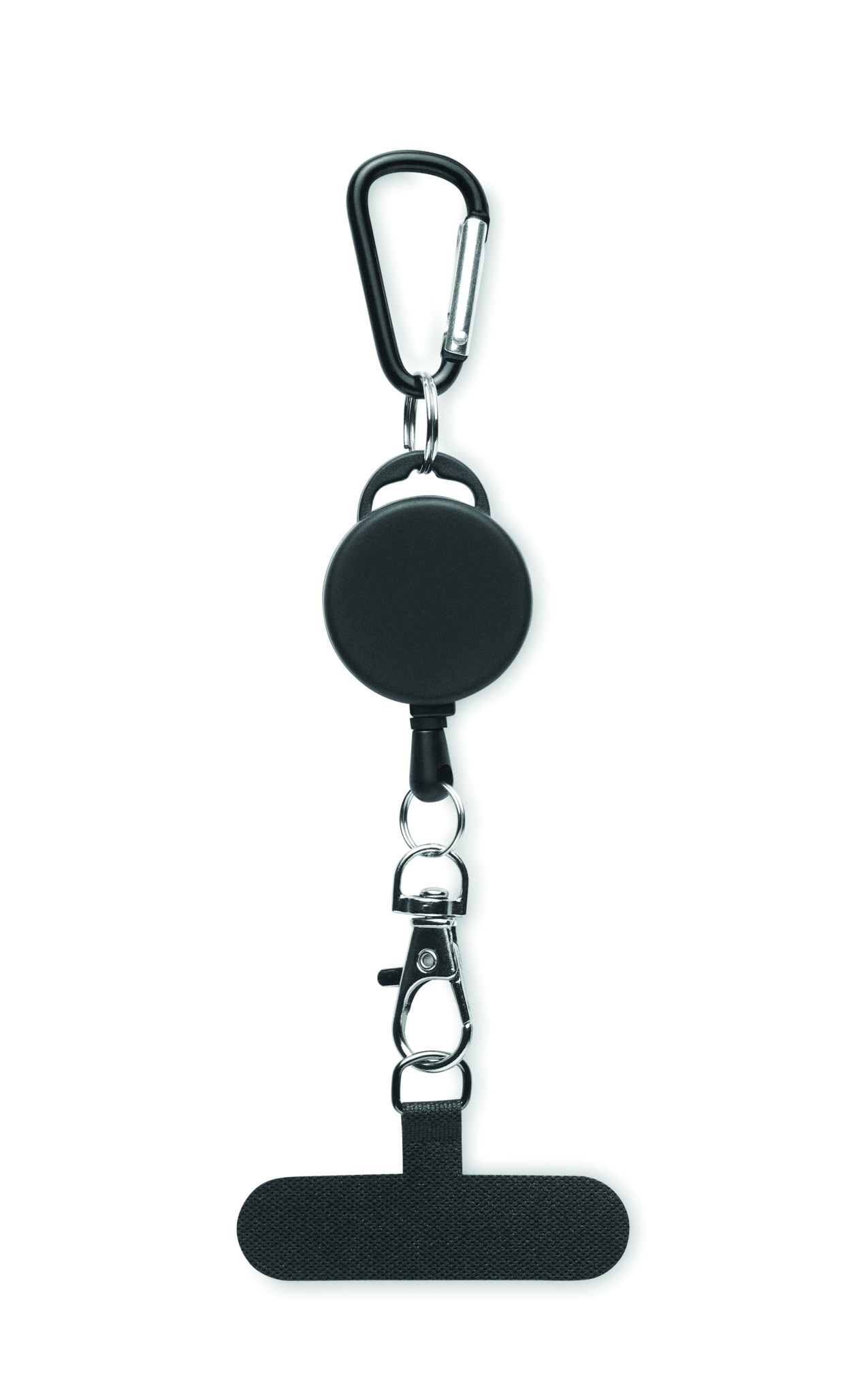 Sisäänvedettävä puhelinpidike ja/tai nimilapun pidike ABS-muovista, jossa alumiininen karabiinilukko. Karabiinilukko ei ole tarkoitettu kiipeilyyn (ei-ammattikäyttöön).