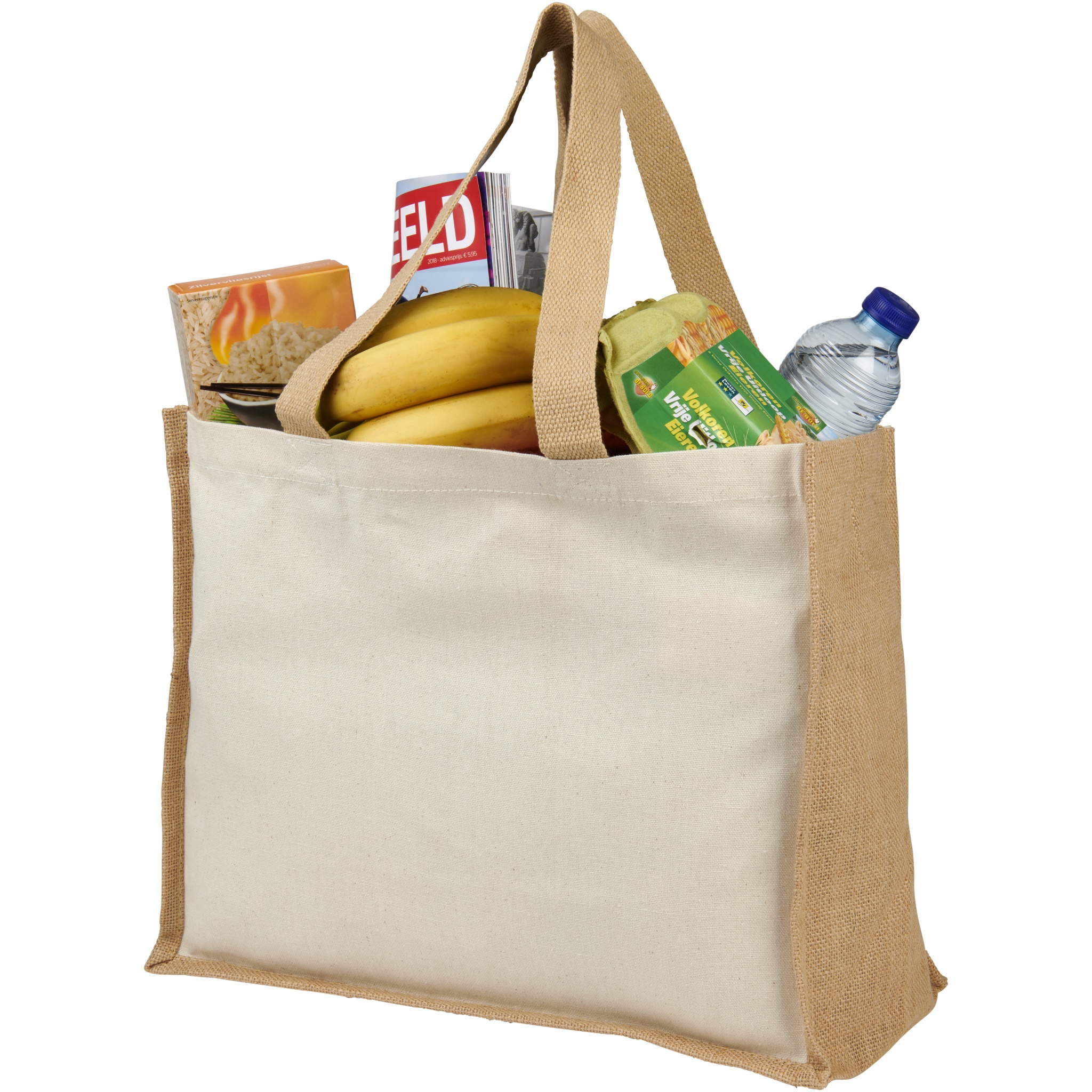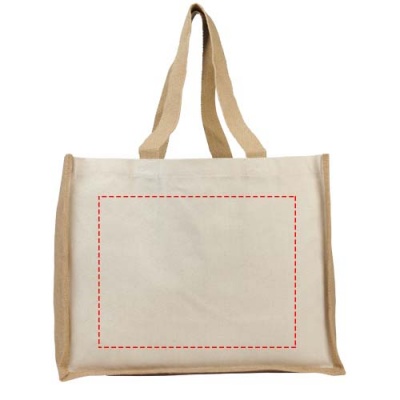 Varai-kangas- ja juuttikangaskassi, jonka tilavuus on 23 litraa. Ihanteellinen laukku ruokaostoksille, viikonloppuretkille tai muuhun päivittäiseen käyttöön. Yhdistelmä 320 g/m² kangasta ja 330 g/m² juuttia antaa laukulle tukevan tuntuman ja jopa 12 kg:n painon kestävyyden. Valmistettu Intiassa ja OEKO-Tex-sertifioitu.