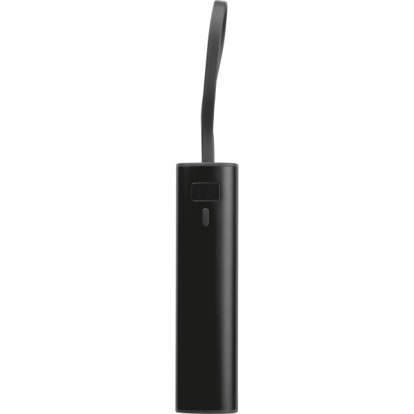 Alumiinista valmistettu varavirtalähde, jossa on 5 000 mAh:n litiumioniakku, lataustason näyttö ja integroitu USB-C-latauskaapeli. Mukana tulee 30 cm:n Type-A - Type-C -latauskaapeli. Logosi on laserkaiverrettu näytön alle.