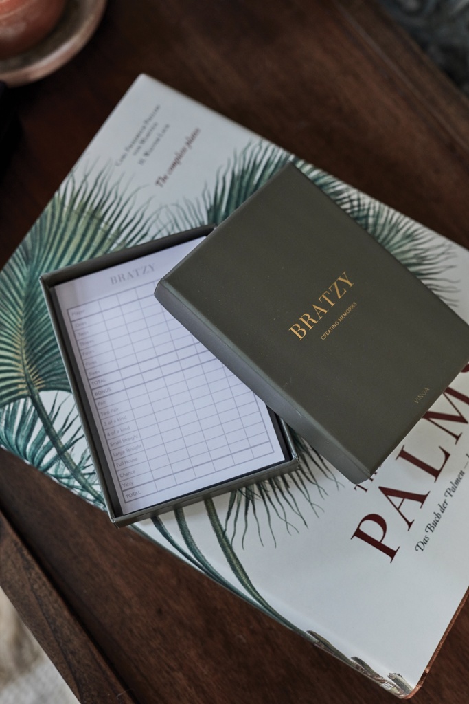 Perinteinen Yatzy ylellisessä pakkauksessa! Kullanväriset nopat ja samaa tyyliä henkivä kynä nostavat Yatzyn uudelle tasolle, ja tuloksena on Bratzy. Peli toimitetaan tyylikkäässä kultakuvioisessa säilytysrasiassa, joka on ilo antaa sekä lahjaksi että pitää omalla sohvapöydällä valmiina pelihetkeen.
