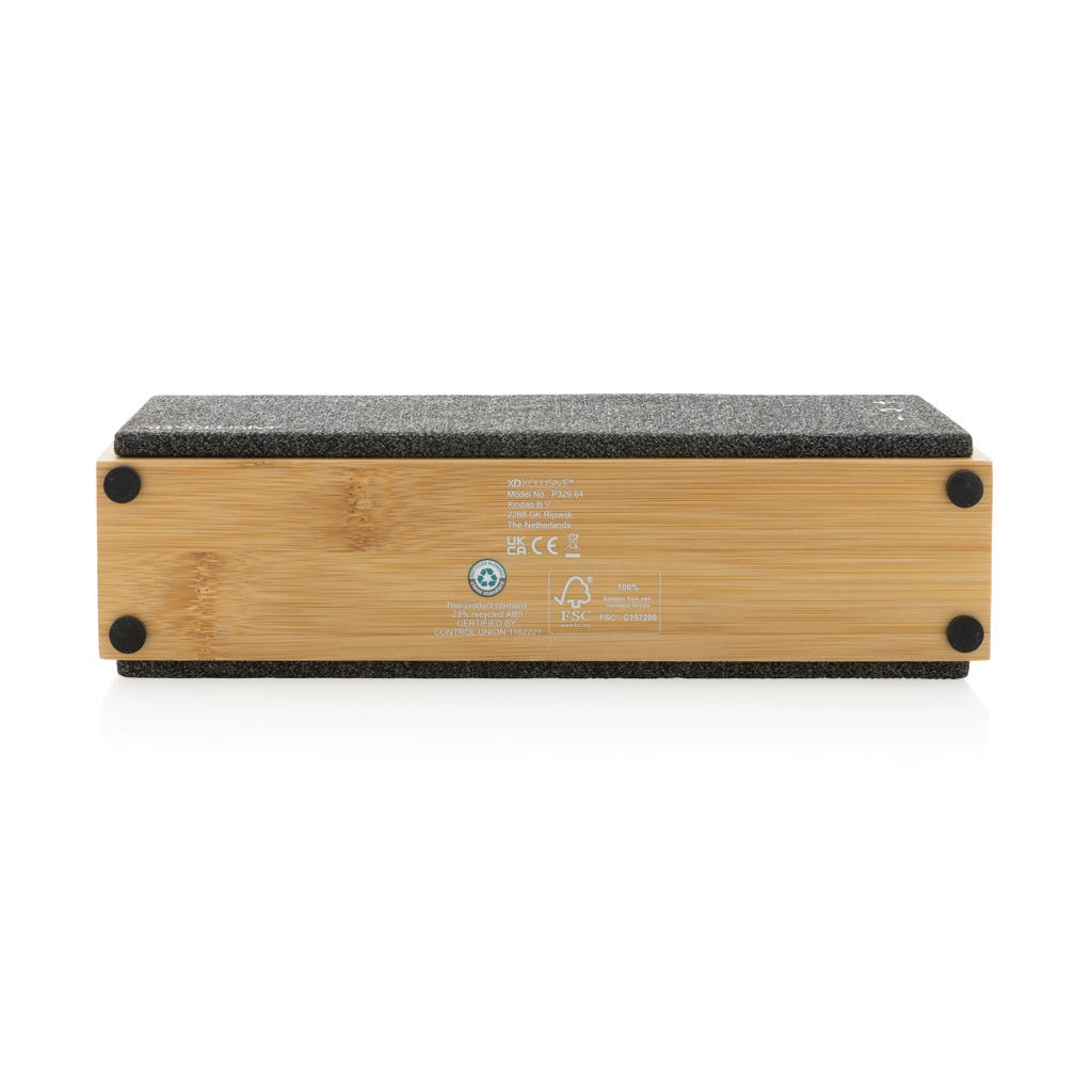Ylellinen 10W kaiutin selkeällä äänentoistolla ja vahvalla bassolla. Ulkokuori on valmistettu FSC 100% sertifioidusta bambusta. Muoviosat on valmistettu RCS (Recycled Claim Standard) sertifioidusta kierrätetystä ABS-materiaalista. Kierrätetyn materiaalin kokonaismäärä: 23% perustuen tuotteen painoon. RCS sertifiointi varmistaa kierrätetyn materiaalin täysin sertifioidun toimitusketjun. Kaiuttimessa on BT 5.1 sulavaa toimintaa varten jopa 10 metrin kantamalle ja alhaiselle energiankulutukselle. 2000 mAh akku mahdollistaa jopa 6 tunnin toistoajan ja se voidaan ladata uudelleen 2 tunnissa. Vastaustoiminnolla ja mikrofonilla puheluita varten. Pakattu FSC-sekoituksesta valmistettuun kraft-pakkaukseen. Sisältää RCS sertifioidun TPE-latauskaapelin.