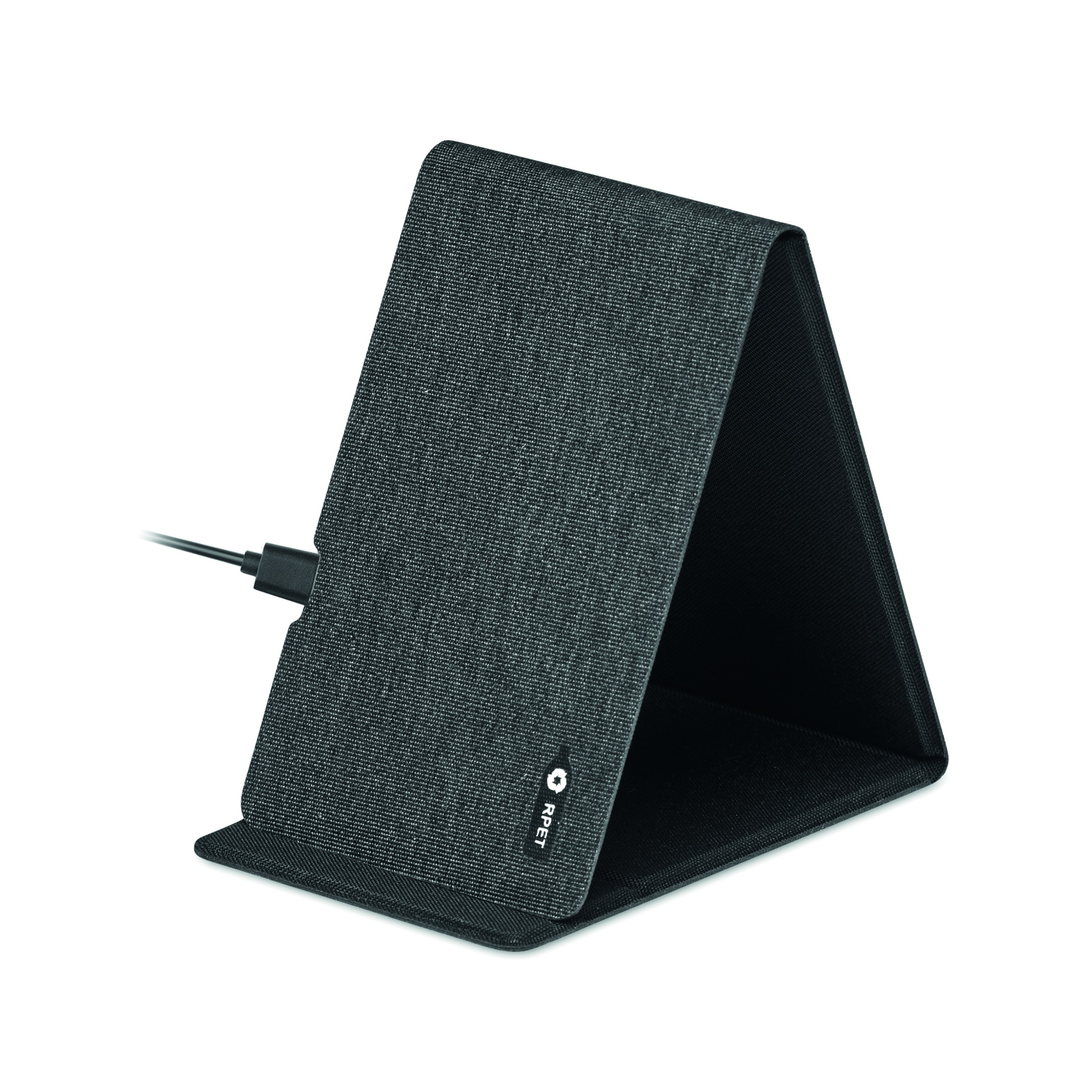 300D 2 tonų RPET ir 15 W belaidžio įkrovimo telefono stovas. Išėjimas: 9V/1.6A (15W) greitam įkrovimui. Suderinamas su naujausiais Android, iPhone® 8 ir naujesniais.