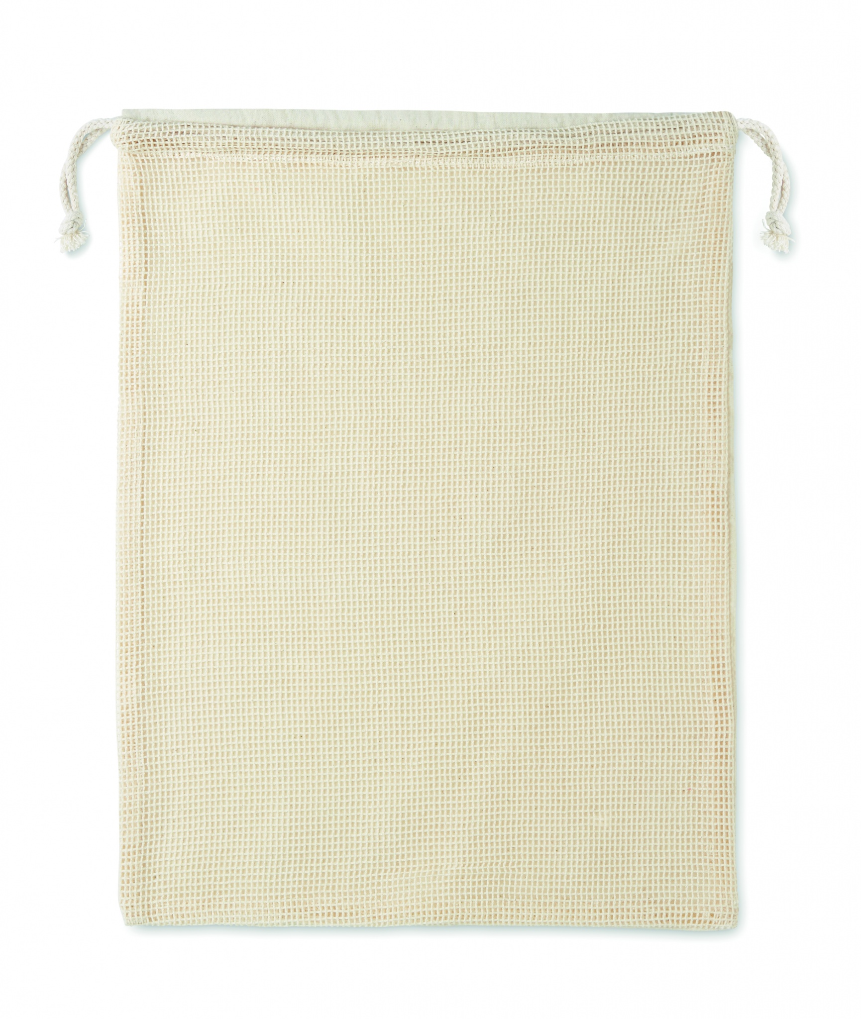 Atkārtoti lietojams pārtikas maisiņš. Viena puse ir no kokvilnas (140gr/m²), bet otra ir no sieta kokvilnas (110gr/m²). Savelkamās auklas aizdare.