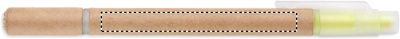 2 vienā otrreiz pārstrādāta kartona mucas lodīšu pildspalva un dzeltens marķieris. Zilā tinte.