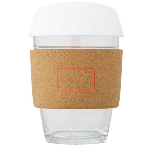Viensienas borsilikāta stikla trauks ar gludu korķa rokturi. Ir noņemams pārtikai drošs silikona vāks. Īkšķis ir izgatavots no 100% izturīga borsilikāta stikla, kas saglabā dzēriena svaigumu un nesatur kaitīgas ķīmiskas vielas. Pārbaudīts un apstiprināts saskaņā ar Vācijas pārtikas nekaitīguma tiesību aktiem (LFGB) un pārbaudīts uz ftalātu saturu saskaņā ar REACH noteikumiem. Ietilpst vairumā kafijas automātu, padarot to par ideālu trauku darbam, atrodoties ceļā. Tilpums ir 360 ml. Noņemot korķa rokturi, trauku var mazgāt trauku mazgājamajā mašīnā. Prezentēts pārstrādāta kartona dāvanu kastītē.