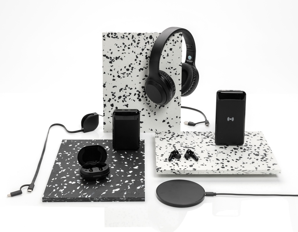 TWS austiņas, kuru austiņas un uzlādes korpuss ir izgatavotas no RCS sertificētas otrreizēji pārstrādātas ABS plastmasas. RCS (Recycled Claim Standard) ir standarts, lai pārbaudītu produkta pārstrādāto saturu visā piegādes ķēdē. RCS ir standarts, ko izmanto, ja preces daļa ir izgatavota no pārstrādātiem materiāliem. Bezvadu austiņās tiek izmantots BT 5.0 īpaši vienmērīgam savienojumam un ilgstošam atskaņošanas laikam. 40 mah akumulators nodrošina atskaņošanas laiku līdz 4 stundām, un to var pilnībā uzlādēt 300 mah uzlādes futrālī 1,5 stundu laikā. Darbības attālums līdz 10 metriem. Ar mikrofonu un skārienpaņemšanas funkciju. Preces un piederumi bez PVC. Ietver PVC nesaturošu pārstrādāta TPE materiāla uzlādes kabeli.
