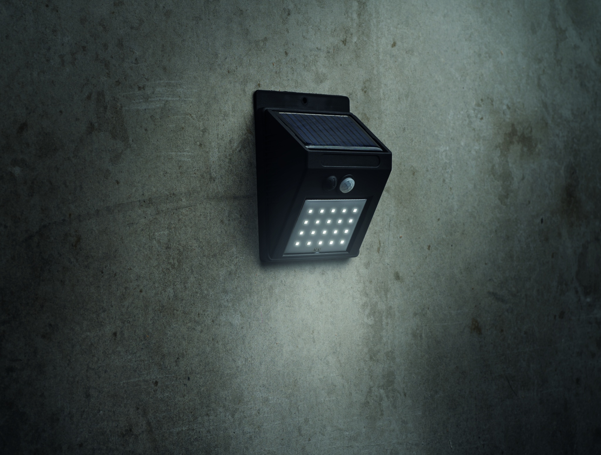20 LED saules gaisma PP ar kustības un nakts sensoriem. PIR (Passive Infrared Sensor) kustības sensors. CDS nakts sensors. Aizsardzības pakāpe: IP 44. Akumulatora ietilpība: 800 mAh.