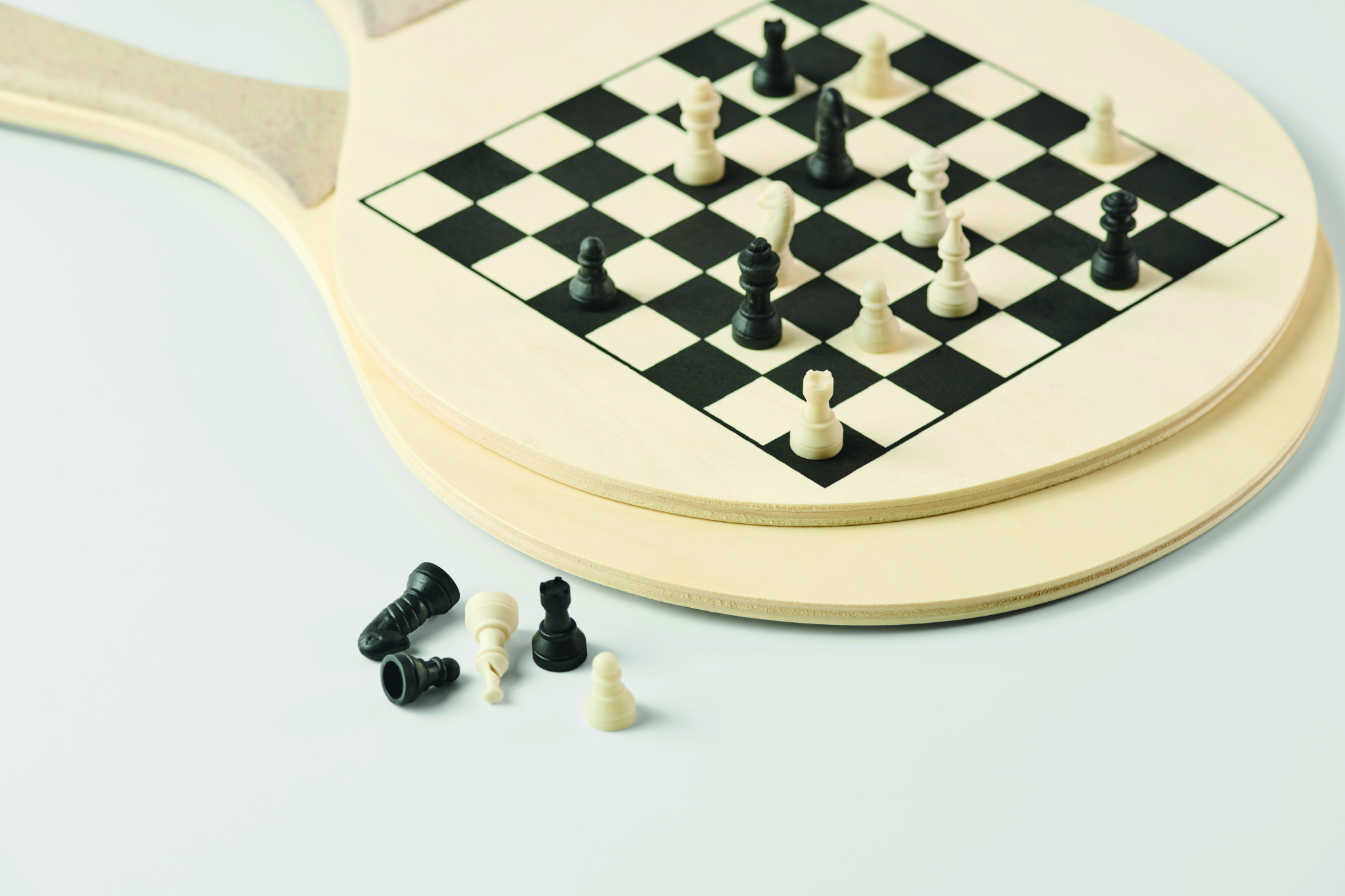 Beach set with 2 plywood rackets featuring a chess and ludo game boards. Includes 1 TPR ball, dice and checkers. Packed in RPET mesh zippered carrier bag.