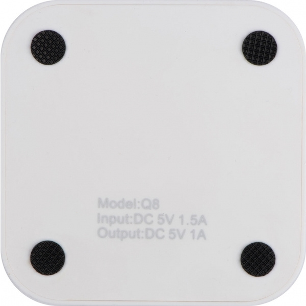 Пластиковое беспроводное зарядное устройство с 2 портами USB, кабель для зарядки в комплекте. Заряжает все смартфоны с поддержкой QI. Ваш логотип будет напечатан на устройстве.