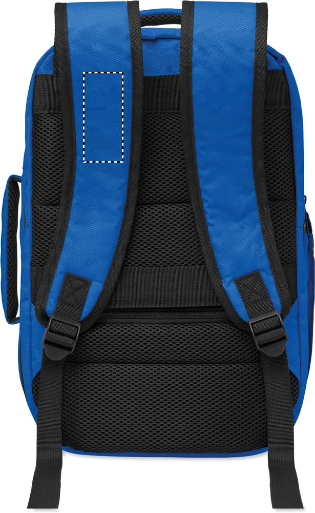 Cabin-size carry-on extendable backpack made of 600D RPET polyester with 180o opening. Features a main compartment with two open sections, mesh division, padded 15'' laptop pocket, and luggage strap.
