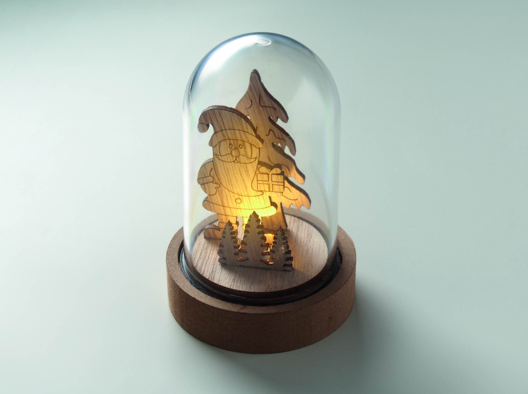 Christmas ornament in MDF and PET case with 1 LED light. Includes 3 cell batteries.