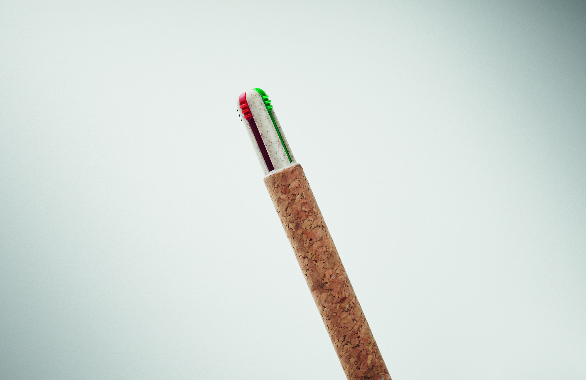 Push button 4-colour ink ball pen with cork barrel and wheat straw (50%) and ABS plastic (50%) fittings.
