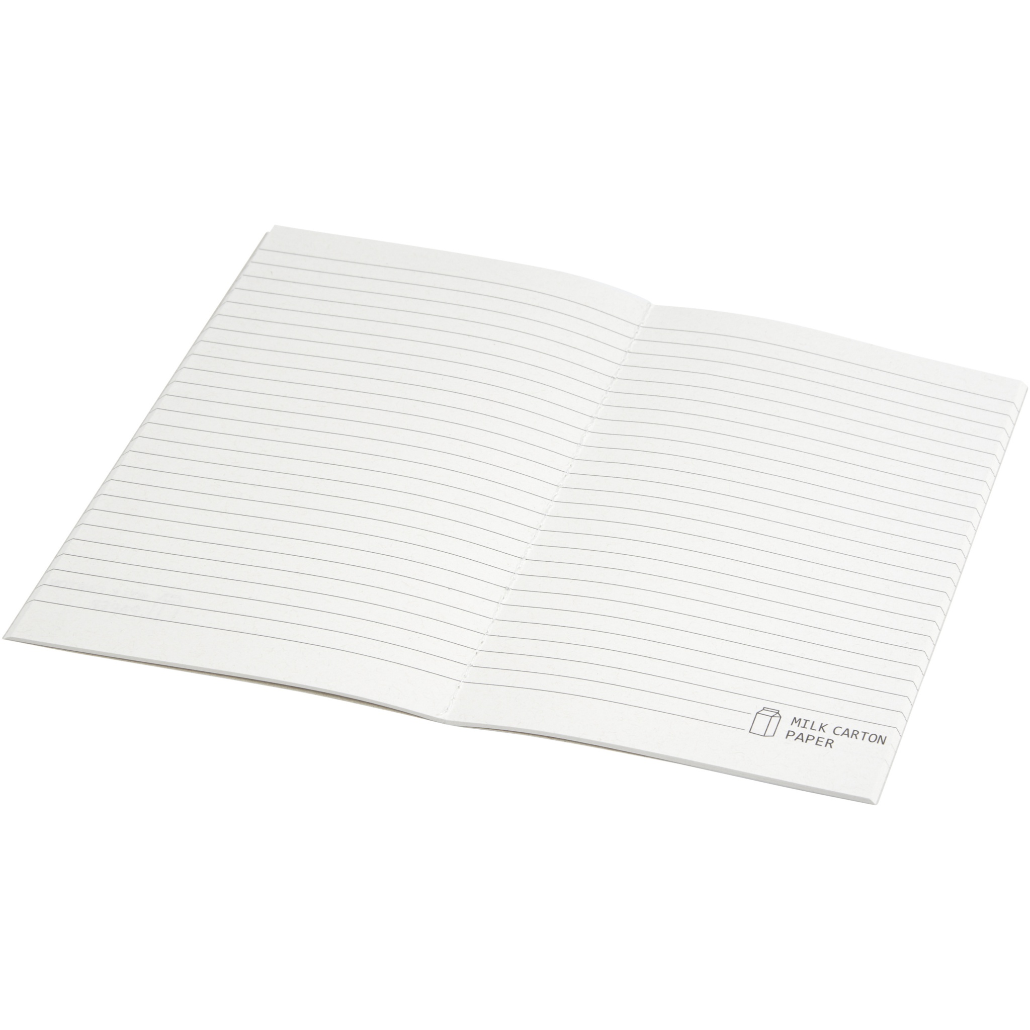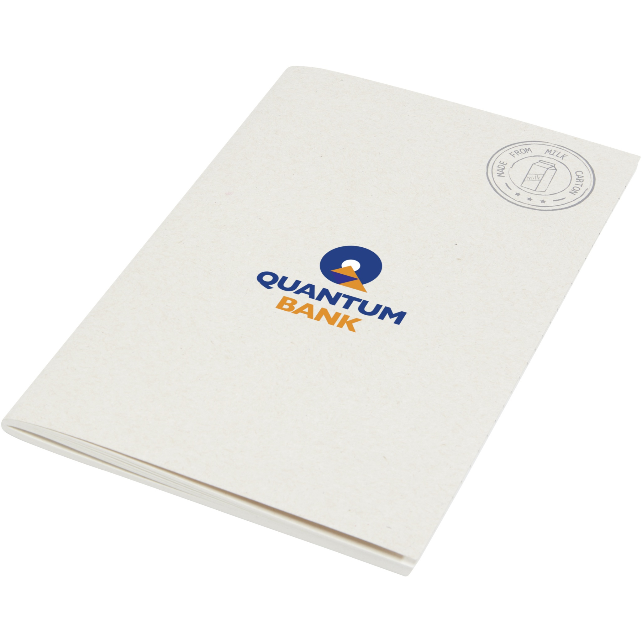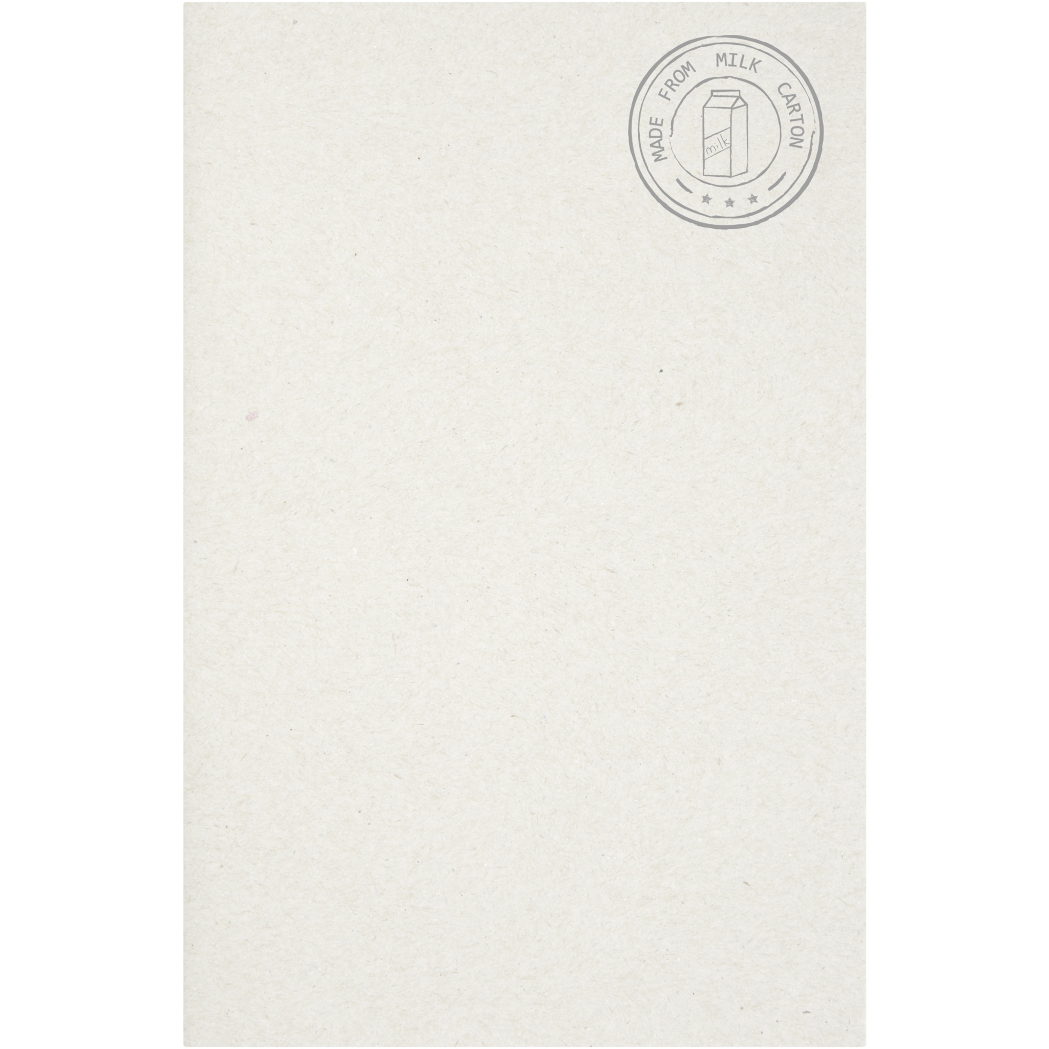 Записная книжка формата А5 с 30 линованными листами плотностью 80 г/м² из переработанных коробок из-под молока (до 70%). Картонные коробки из-под молока собираются, сортируются, перерабатываются и превращаются в бумагу, таким образом действительно превращая мусор во что-то полезное.