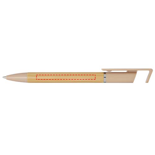 Бамбуковая шариковая ручка, которая также может служить подставкой для телефона. Кнопка и среднее кольцо изготовлены из переработанного пластика, наконечник — из латуни, а корпус — из бамбука, полученного из ответственных источников. Цвет чернил: синий. Длина непрерывной линии: 1000 метров. Размер пера: 1,0 мм.