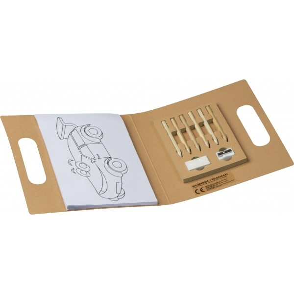 Папка-раскраска с переработанной обложкой, блоком красок (30 листов), держателем для переноски, точилкой, ластиком и мелками 6 разных цветов. Ваш логотип будет напечатан на обложке.