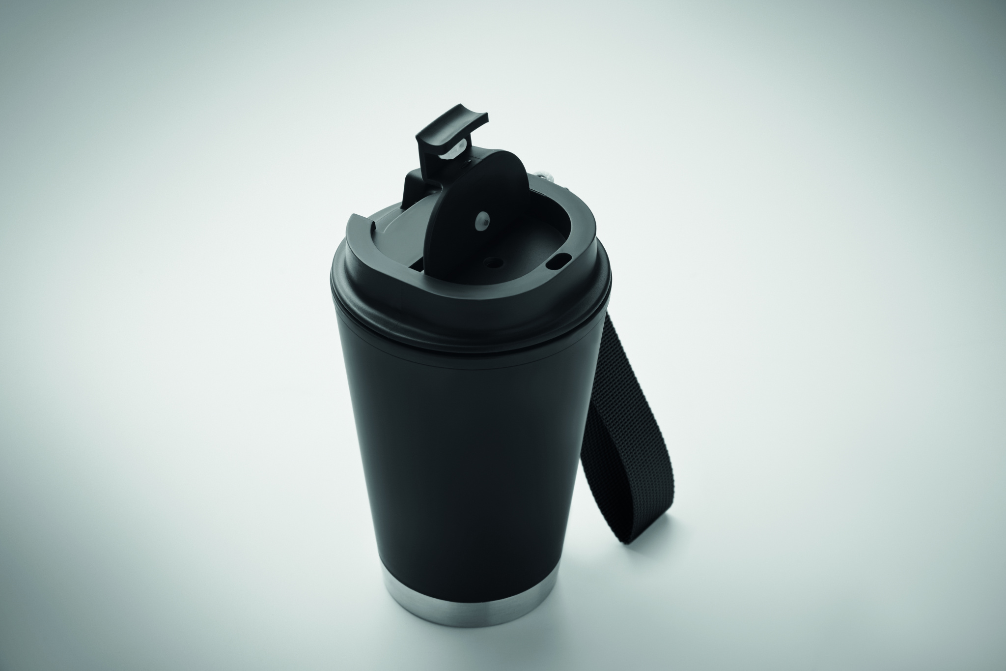 Double wall tumbler in PP inner wall, recycled PP outside wall, recycled stainless steel detail and RPET wrist strap. Capacity: 300 ml.