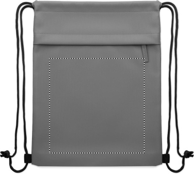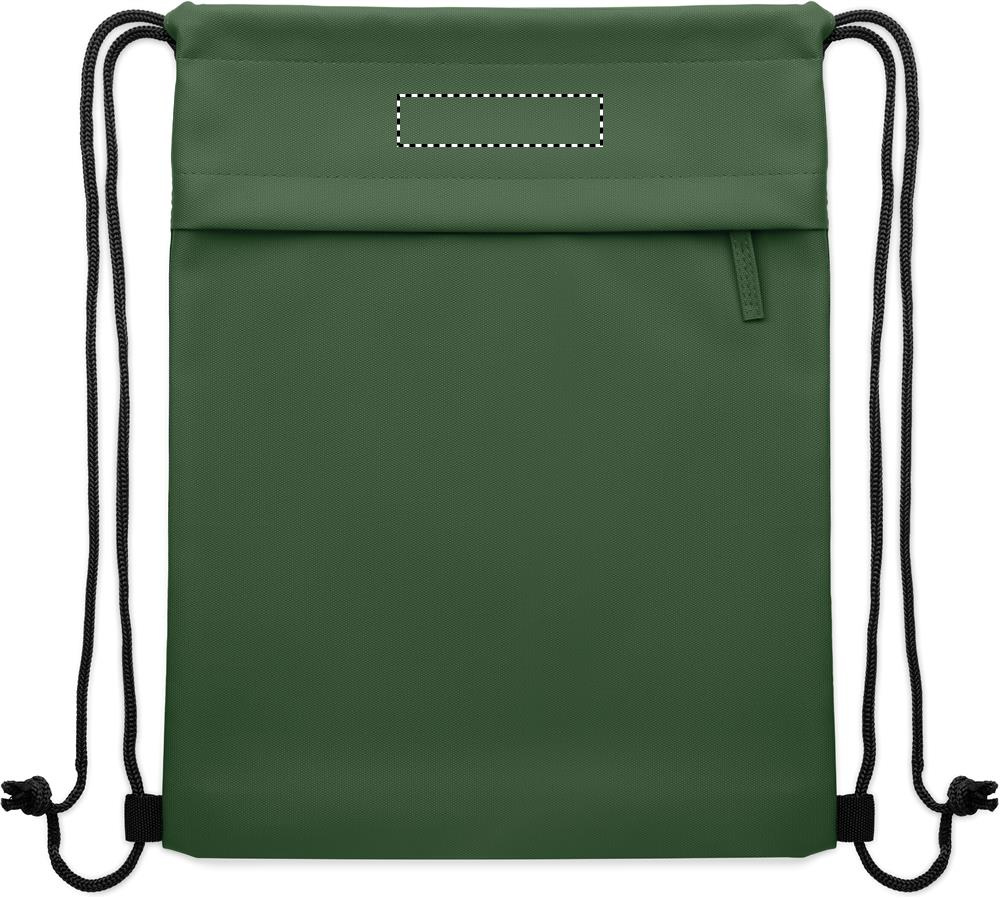 Drawstring bag with PU coated 600D RPET polyester and 190T RPET polyester lining. Zippered front pocket.