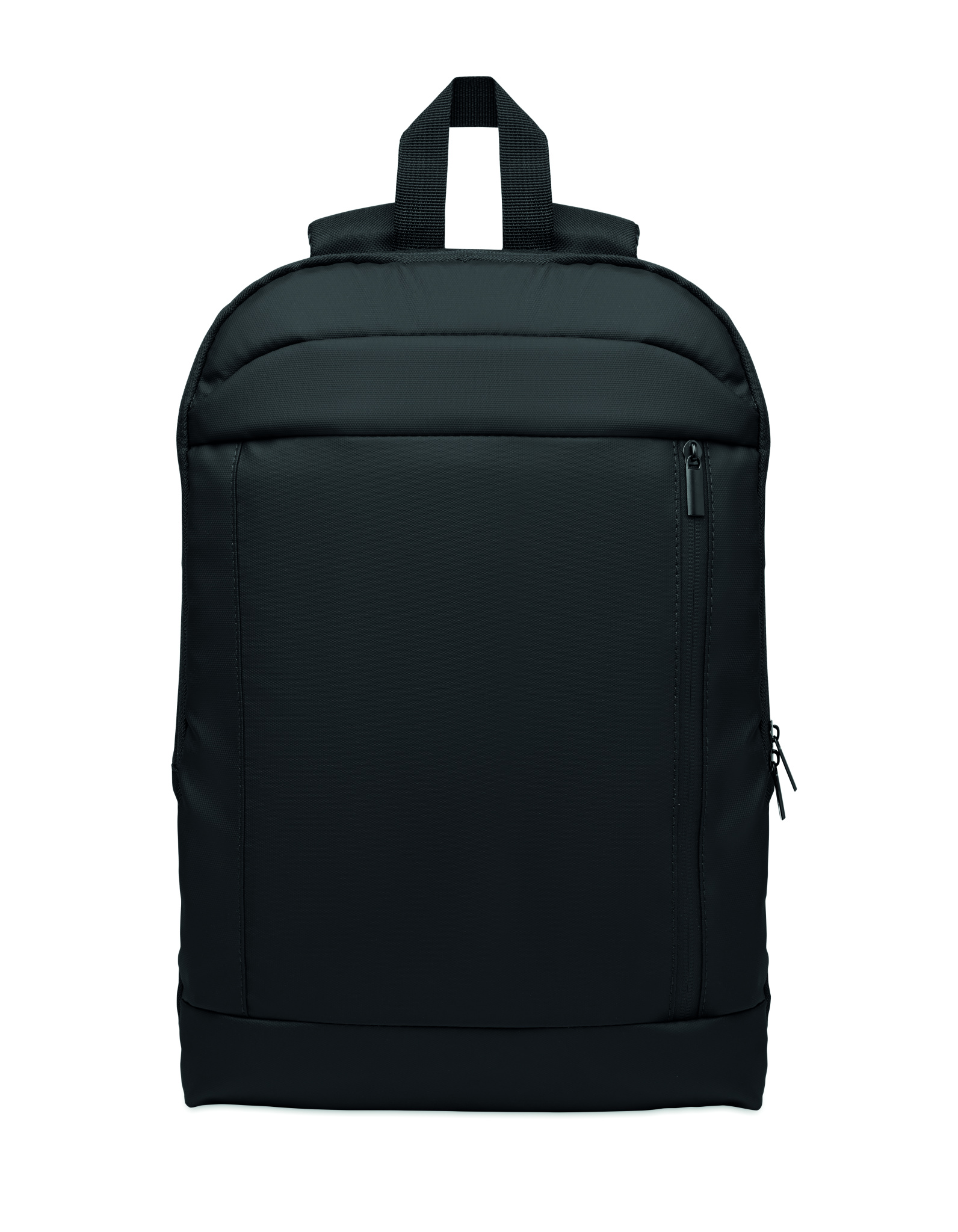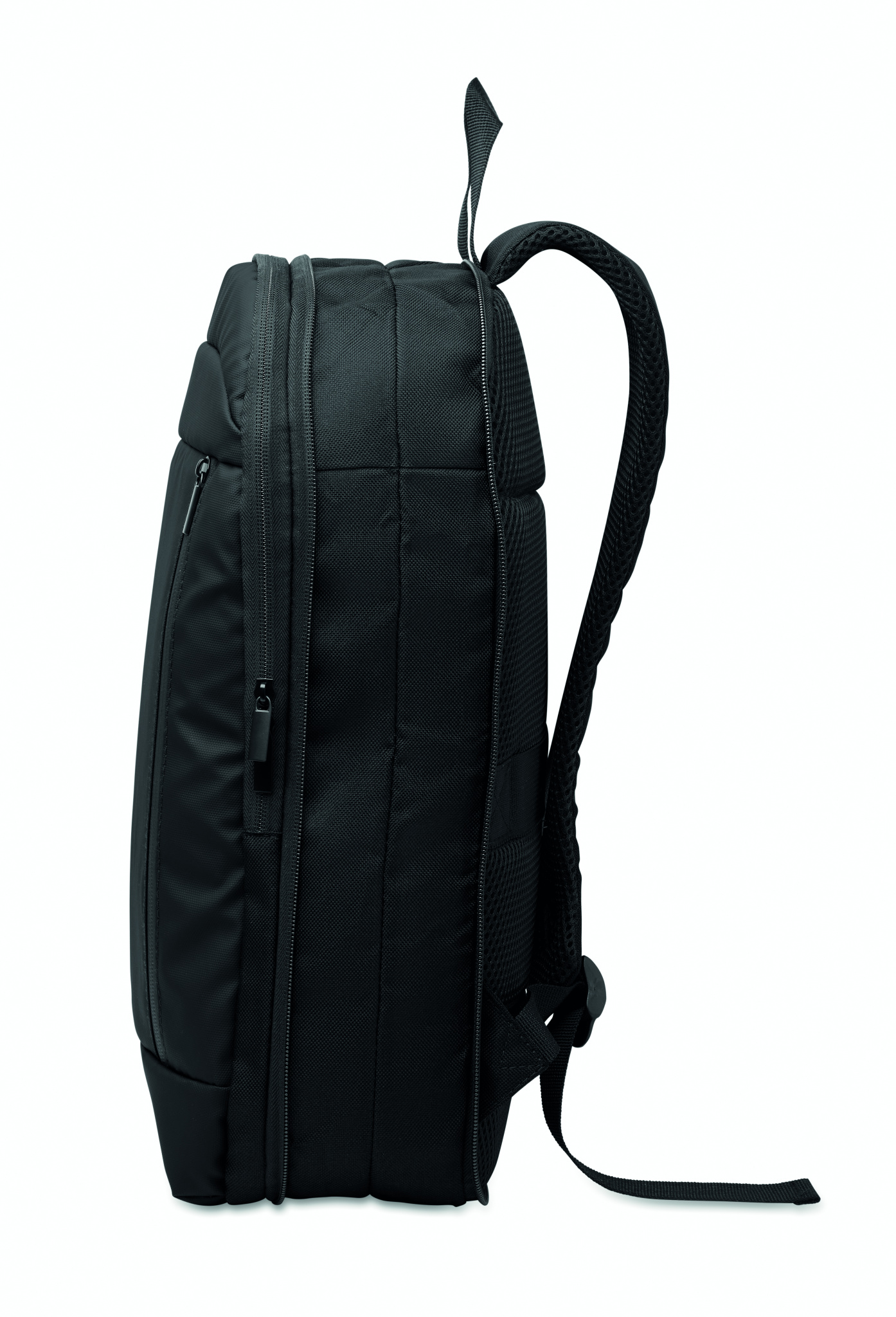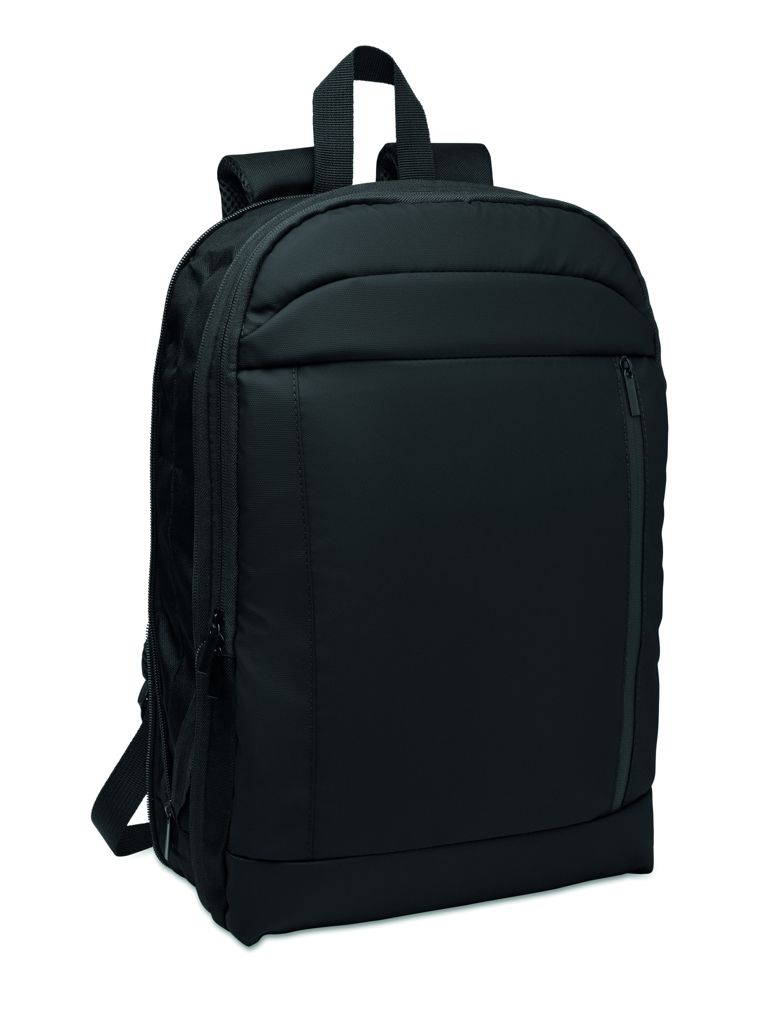 Expandable 600D RPET polyester computer backpack 16'' with PU coating on front and RPET polyester lining. Hidden zippered pocket and padded laptop compartment, front compartment, mesh back and luggage strap.